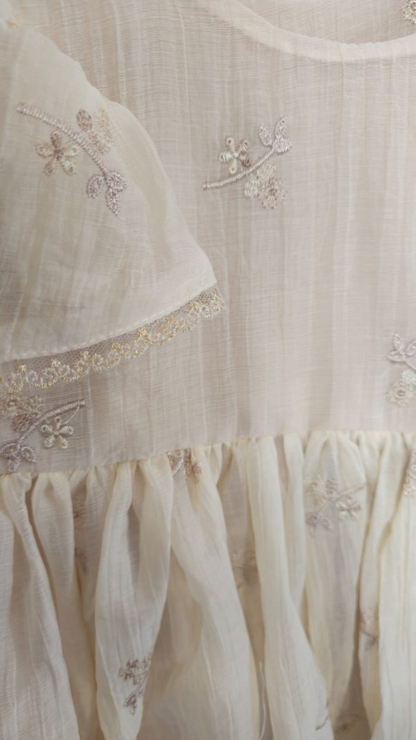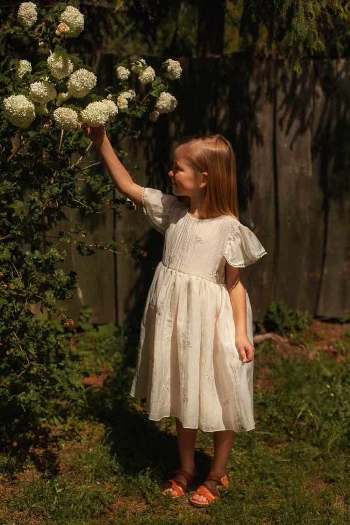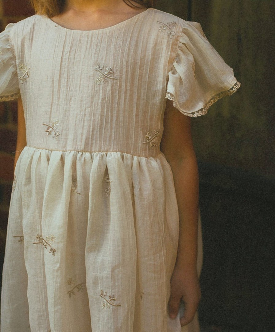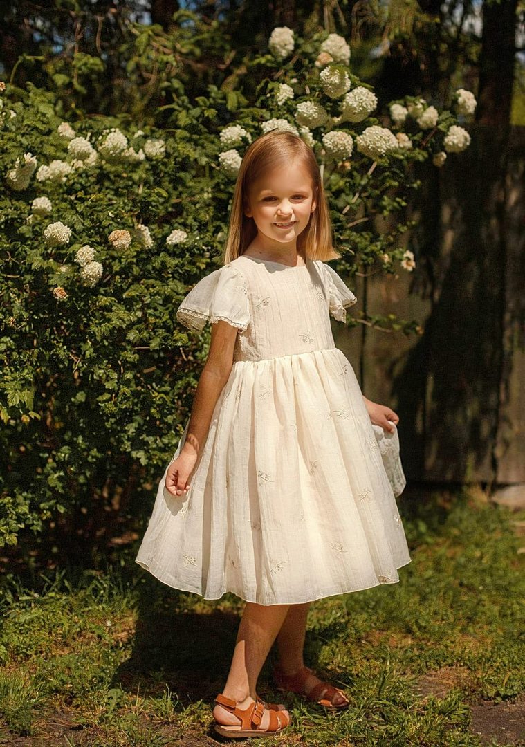 Ta dziewczęca sukienka to idealne połączenie lekkości, naturalności i ponadczasowego stylu. Wykonana z delikatnego batystu w kolorze ecru, zachwyca złotym haftem i romantycznymi falbankami. To doskonały wybór na ciepłe dni, kiedy liczy się zarówno wygląd, jak i wygoda.