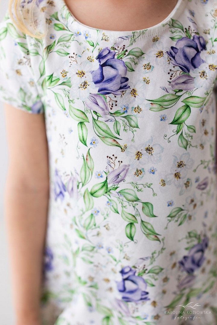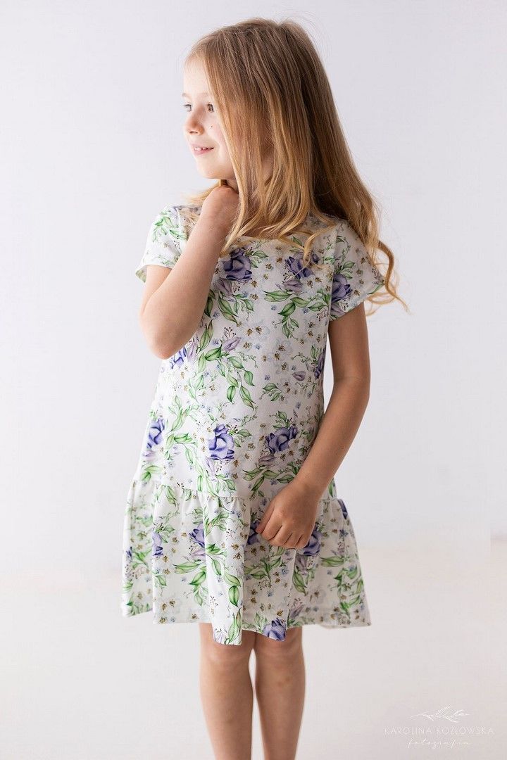 Przepiękna sukienka wykonana z bawełny premium, ozdobiona delikatnym wzorem kwiatów w odcieniach fioletu i zieleni na jasnym tle. Idealna na letnie dni, sukienka jest lekka, przewiewna i bardzo wygodna. Sukienka dostępna w rozmiarach od 104 do 140.
