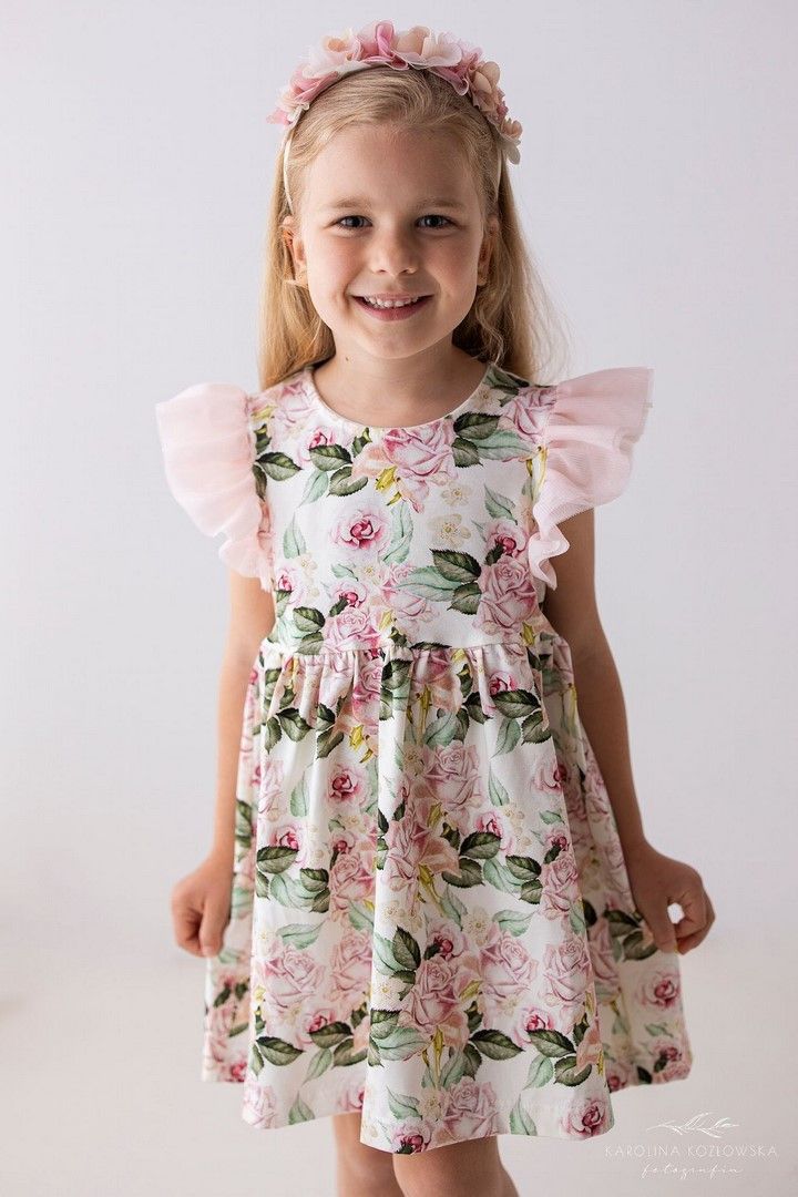 Przepiękna sukienka wykonana z miękkiej bawełny, ozdobiona wzorem róż na jasnym tle, idealna na ciepłe, letnie dni. Tiulowe rękawki dodają lekkości i romantycznego uroku. Sukienka zakładana przez głowę, co zapewnia wygodę noszenia. Dostępna w rozmiarach od 98 do 140, jest doskonałym wyborem dla dziewczynek w różnym wieku.