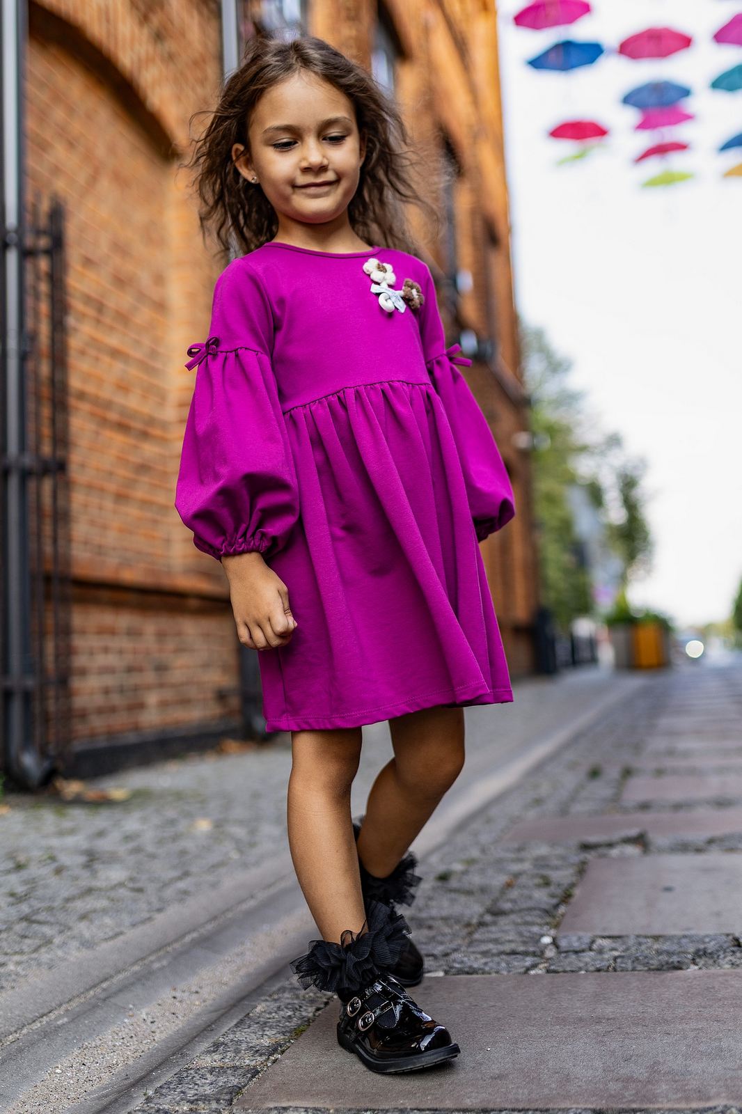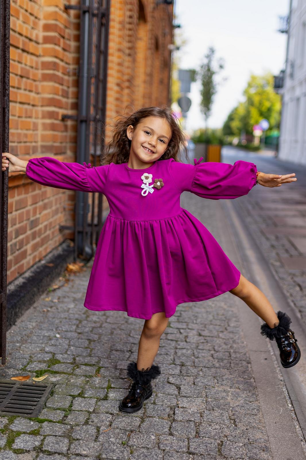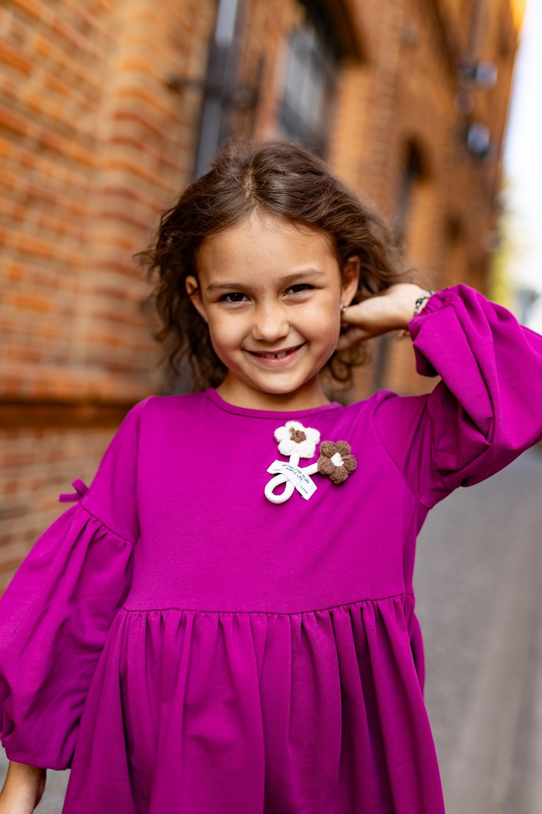 Ta bawełniana sukienka w ciemnym różu to doskonała propozycja dla dziewczynek, które cenią sobie delikatne, a zarazem efektowne ubrania. Została ozdobiona trójwymiarowymi aplikacjami kwiatów oraz kokardkami na bufiastych rękawach, co nadaje jej wyjątkowego charakteru.
