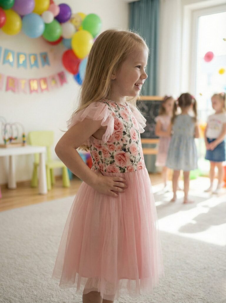 - Dół sukienki: Tiulowy, lekki i zwiewny, idealny na letnie dni i wyjątkowe okazje.
