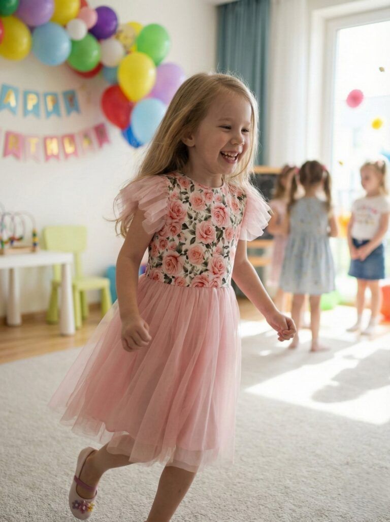 - Góra sukienki: Wykonana z bawełny, zapewniająca komfort i przewiewność, z tiulowymi rękawkami w kształcie motylków.