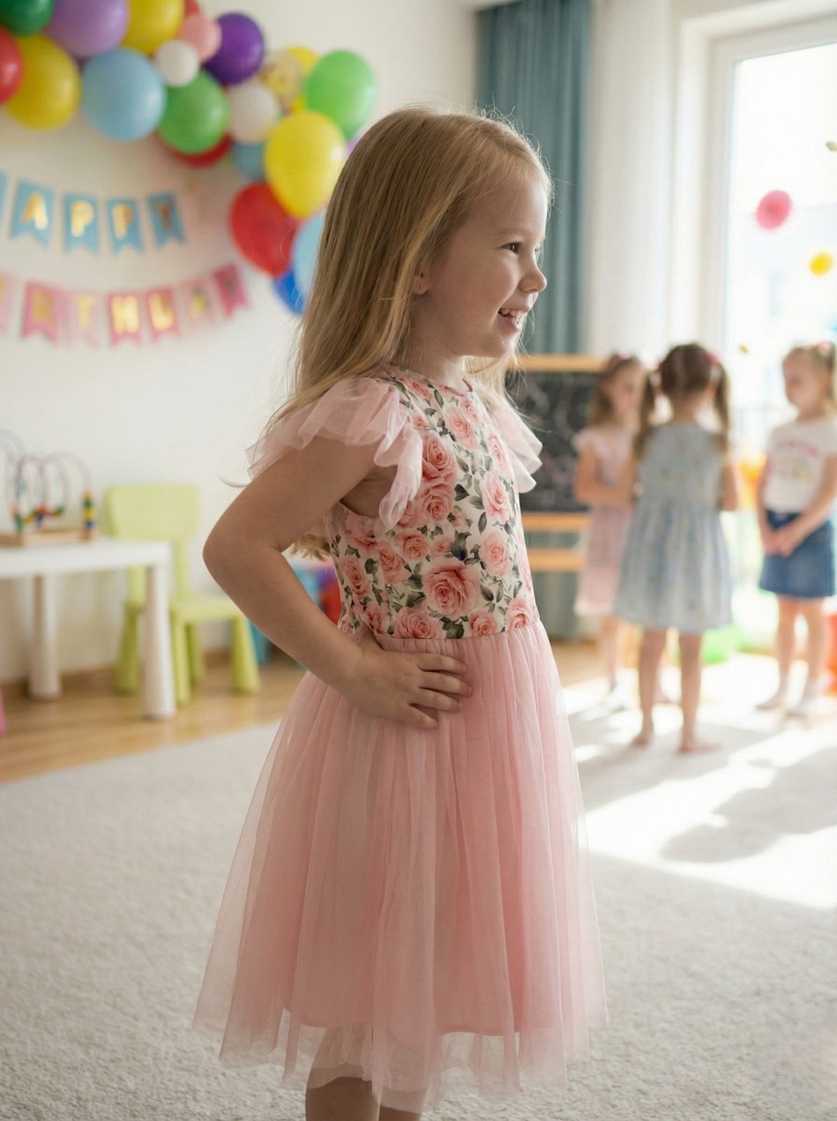 - Materiał: Wysokiej jakości bawełna na górze i tiul na dole, co sprawia, że sukienka jest wygodna i elegancka.