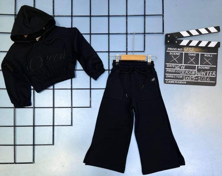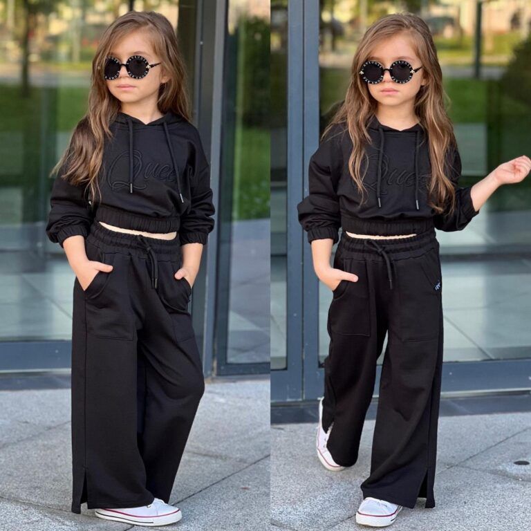 Ten elegancki czarny komplet dresowy to doskonały wybór dla każdej dziewczynki, która pragnie połączyć komfort z modnym wyglądem.