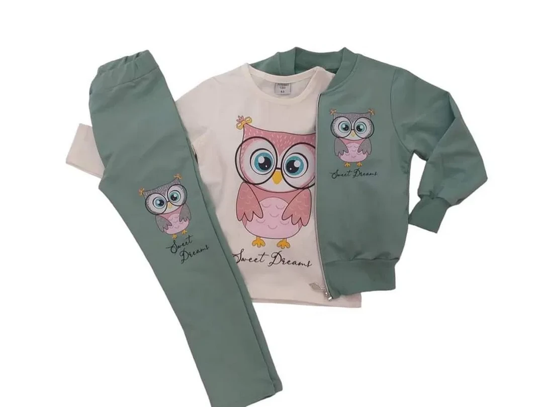 Oferujemy stylowy trzyczęściowy komplet dla dziewczynki, dostępny w rozmiarach od 98 do 140. Zestaw zawiera bluzkę w kolorze ecru z atrakcyjnym nadrukiem różowej, błyszczącej sowy, która doda każdej stylizacji odrobiny uroku. Komplet uzupełnia zielona, bawełniana bluza, bez kaptura z delikatnym nadrukiem sowy, idealna do noszenia na co dzień. Do kompletu dołączone są także zielone leginsy na elastycznej gumce, zaprojektowane z myślą o komforcie i swobodzie ruchów. Delikatnie zwężane nogawki leginsów zapewniają modny wygląd i pasują do różnorodnych rodzajów obuwia. Wykonany z bawełny, komplet jest praktyczny i wygodny, co czyni go odpowiednim wyborem na wiosenne i letnie dni. Idealny do szkoły, zabaw na świeżym powietrzu czy na rodzinne wyjścia, ten zielony komplet to wszechstronny wybór dla aktywnych dziewcząt.