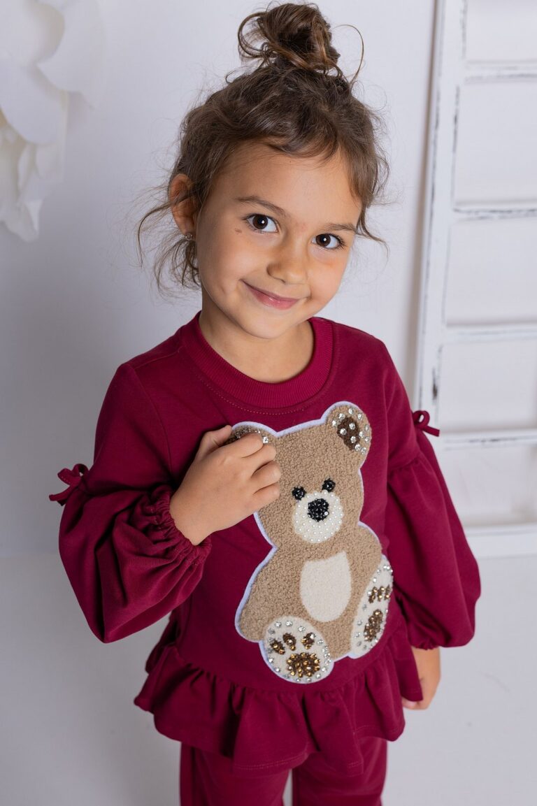 - Kolor i Wzór: głęboki bordowy kolor z uroczą aplikacją misia na bluzce
