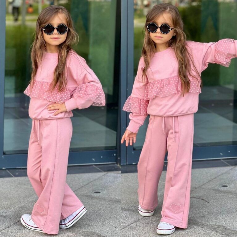 Uroczy różowy dres dla dziewczynki, zaprojektowany z myślą o stylu i wygodzie. Delikatne falbanki z tiulu w kropki na bluzie oraz luźne spodnie dzwony dodają temu zestawowi modnego i eleganckiego wyglądu. Idealny na codzienne spacery,do przedszkola czy spotkania z przyjaciółmi.