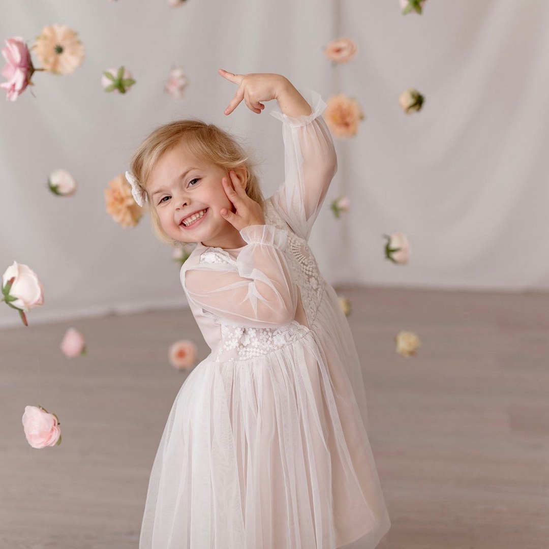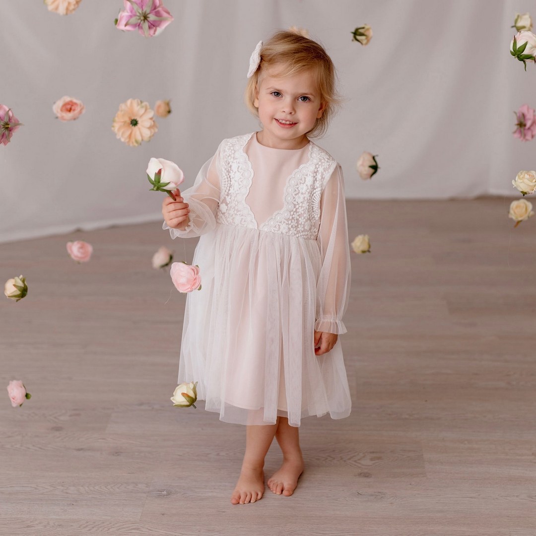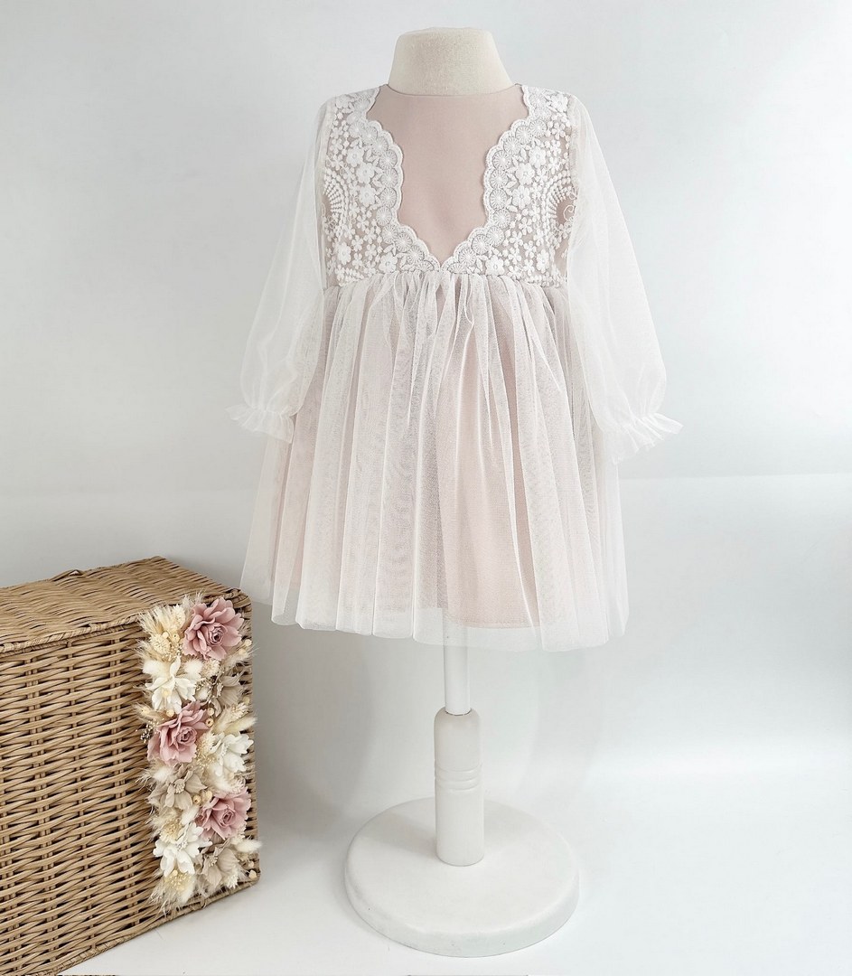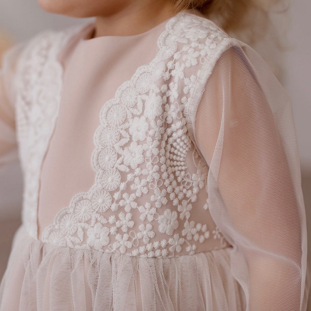 Delikatna i elegancka sukienka w odcieniach ecru i beżu to doskonały wybór na wyjątkowe okazje. Jej subtelny haft na jasnym tiulu oraz miękka, matowa tkanina sprawiają, że każda dziewczynka poczuje się w niej wyjątkowo. Zapinana na guziczek z tyłu, zapewnia wygodne zakładanie i ładnie układa się na sylwetce.