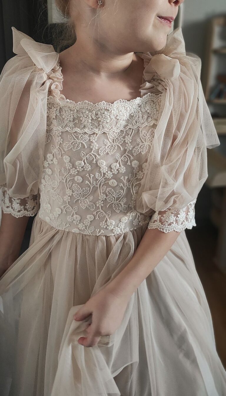 Ta tiulowa sukienka dla dziewczynki to doskonały wybór na wyjątkowe uroczystości. Miękka podszewka z wiskozy zapewnia wygodę noszenia, a delikatne koronki dodają elegancji i subtelnego uroku. Spódnica uszyta z koła pięknie się układa, podkreślając lekkość i dziewczęcy charakter stroju.