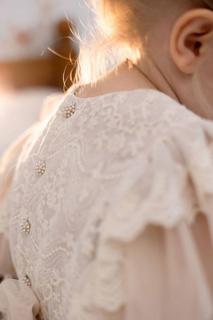 - Elementy: koronkowy karczek, tiulowy dół, zapięcie z tyłu na perłowe guziczki