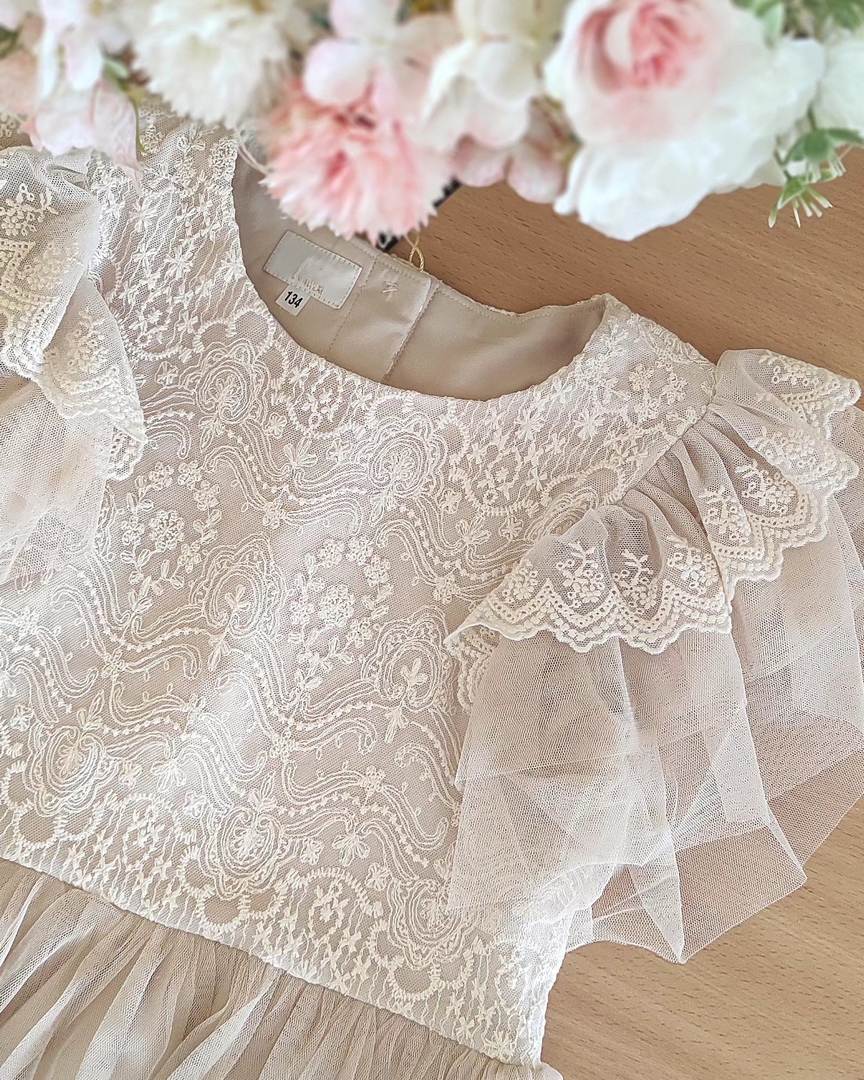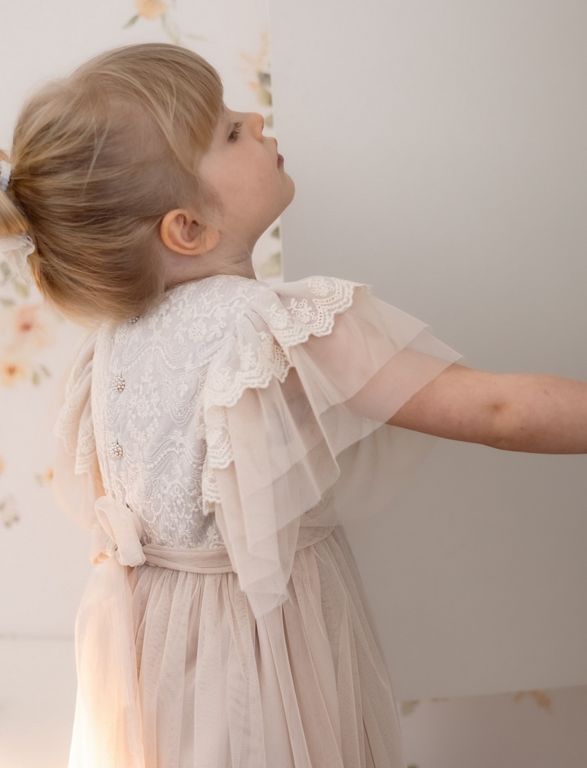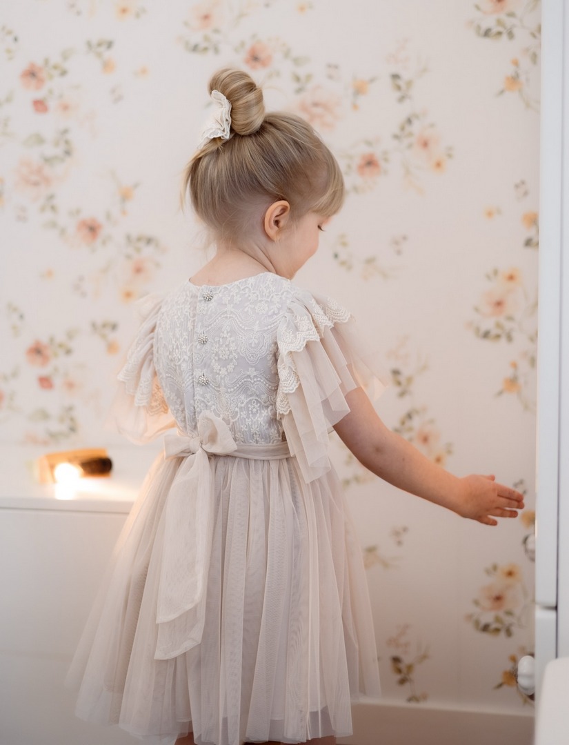 Delikatna i efektowna – ta beżowa sukienka tiulowa to doskonały wybór dla dziewczynek na wyjątkowe chwile. Lekka, przewiewna i ozdobioną piękną koronką, łączy w sobie dziewczęcy urok z eleganckim wykończeniem. Krótkie wielowarstwowe rękawki sprawiają, że sprawdzi się idealnie w cieplejsze dni, a miękka podszewka z wiskozy zapewnia wygodę przez cały dzień.