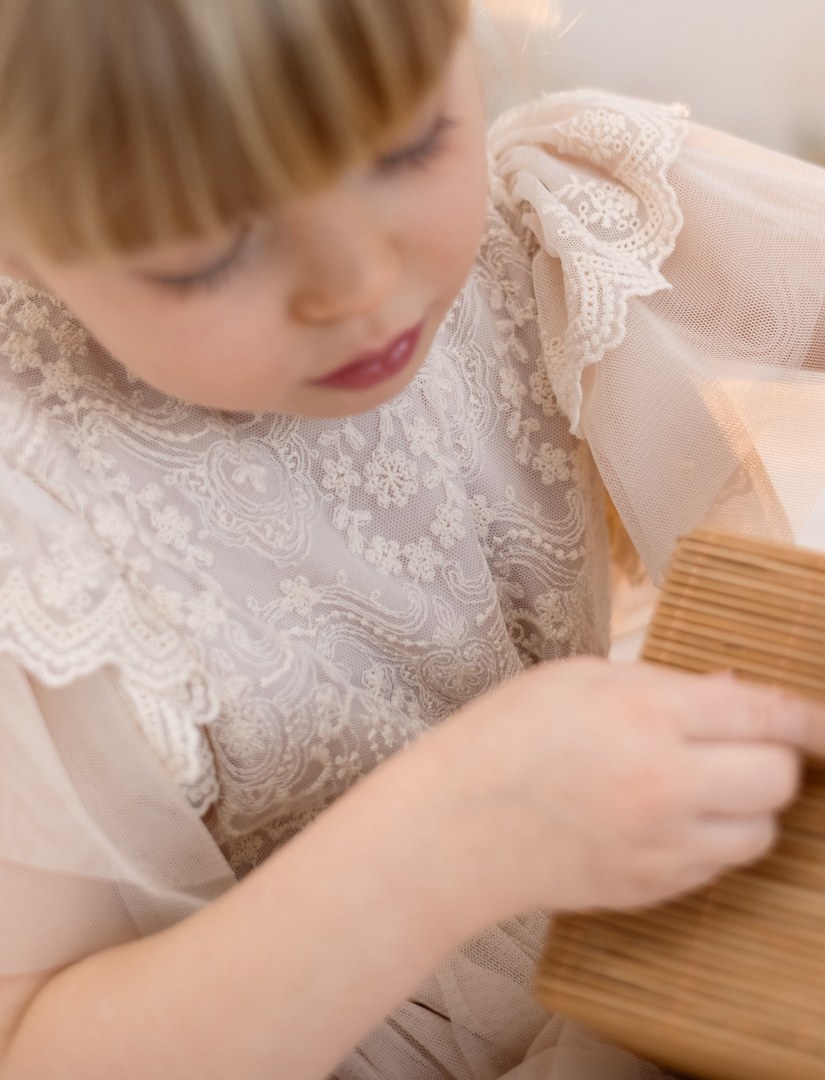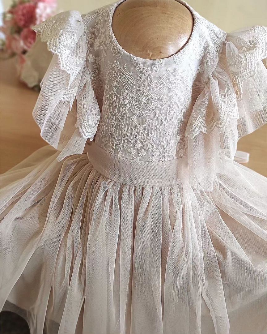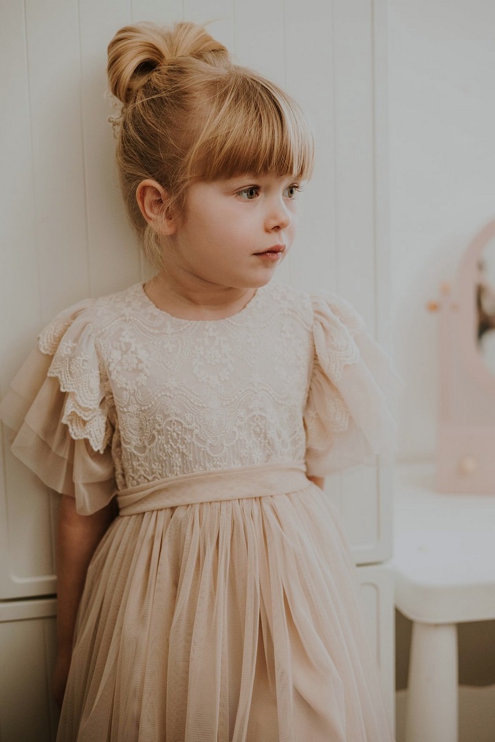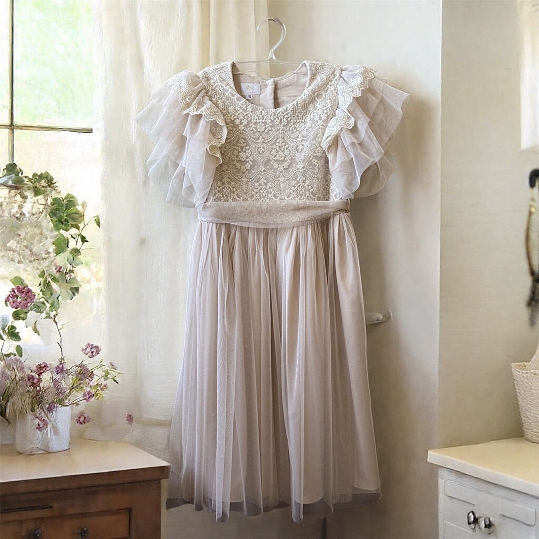 Delikatna i efektowna – ta beżowa sukienka tiulowa to doskonały wybór dla dziewczynek na wyjątkowe chwile. Lekka, przewiewna i ozdobioną piękną koronką, łączy w sobie dziewczęcy urok z eleganckim wykończeniem. Krótkie wielowarstwowe rękawki sprawiają, że sprawdzi się idealnie w cieplejsze dni, a miękka podszewka z wiskozy zapewnia wygodę przez cały dzień.