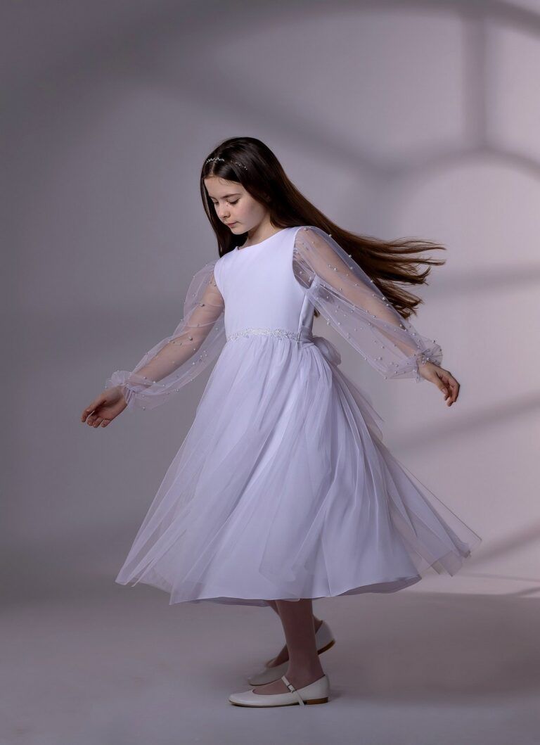 Subtelna sukienka w czystej bieli to doskonała propozycja na wyjątkowe uroczystości, takie jak Pierwsza Komunia Święta. Jej klasyczny fason z nowoczesnymi akcentami sprawia, że każda dziewczynka poczuje się wyjątkowo i elegancko.