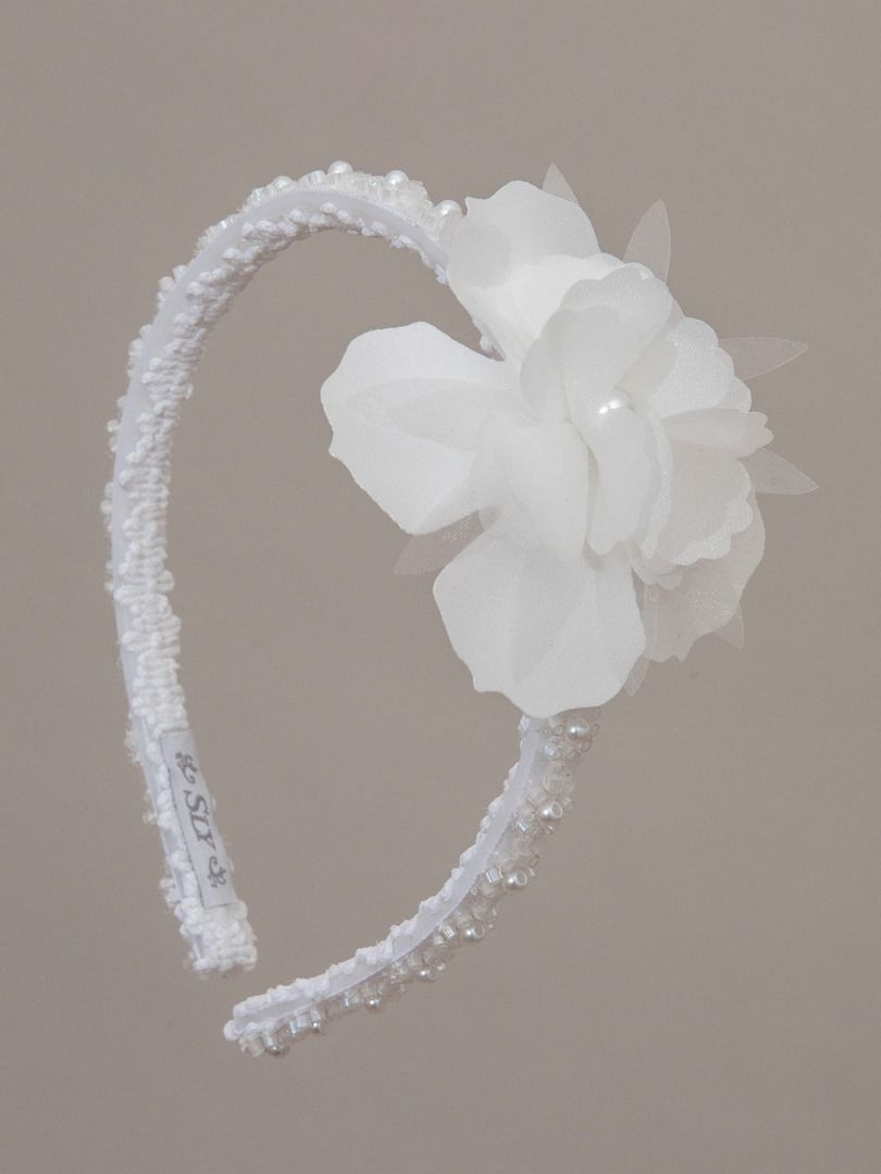 Biała opaska do Komunii przyozdobiona kwiatem z perełką