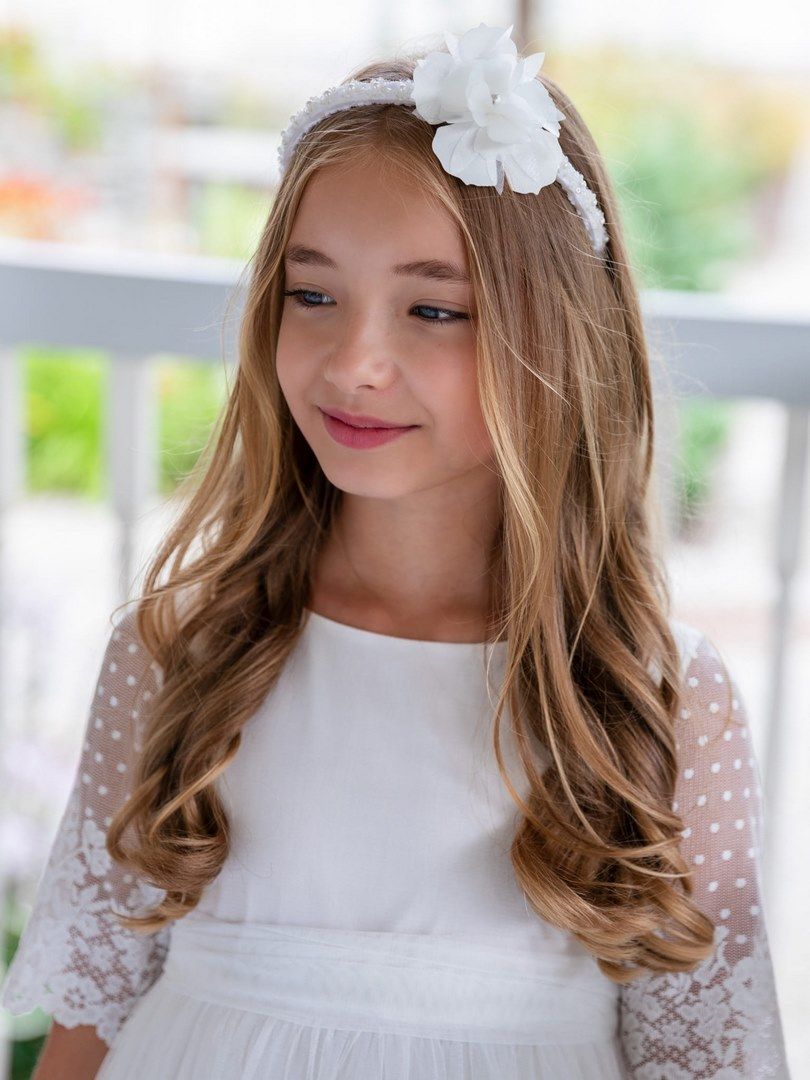 Biała opaska do Komunii przyozdobiona kwiatem z perełką, na dziewczynce