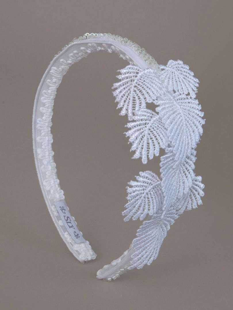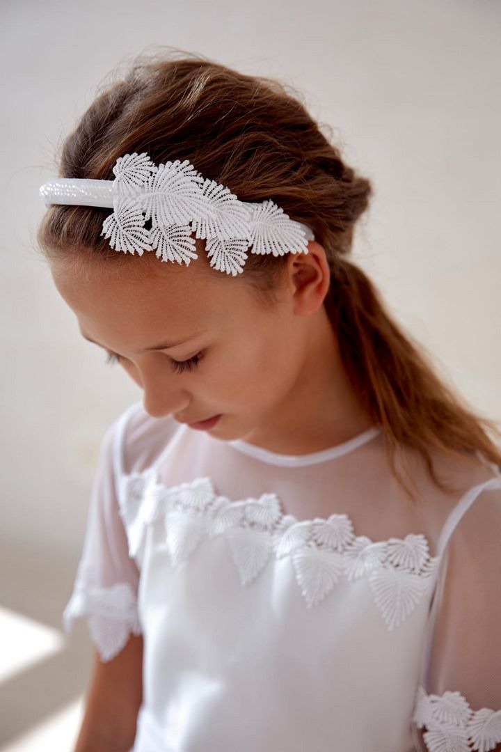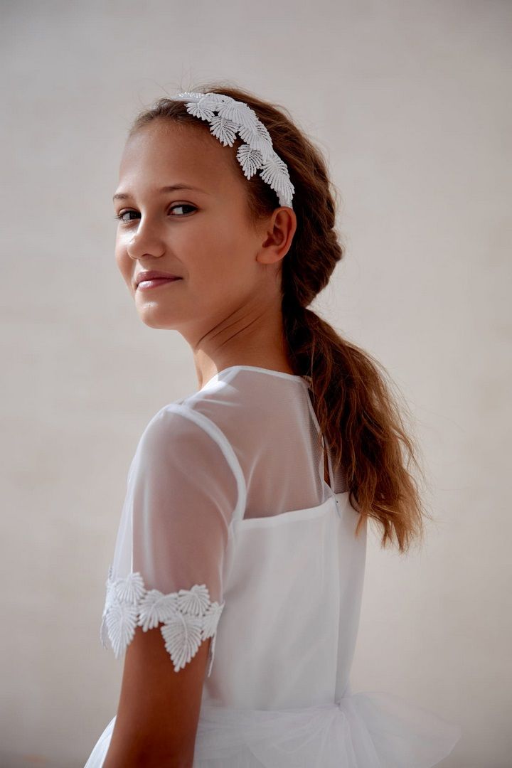 Przepiękna biała opaska do włosów, ręcznie wykonana z taśmy. Przyozdobiona dekoracyjnymi listkami. Wizytowa, okolicznościowa nadająca się jako dodatek; do Pierwszej Komunii Świętej, na wesele, urodziny. Wykonana z szczególną dbałością o każdy detal. Doskonale pasująca do sukienek z kolekcji komunijnej.