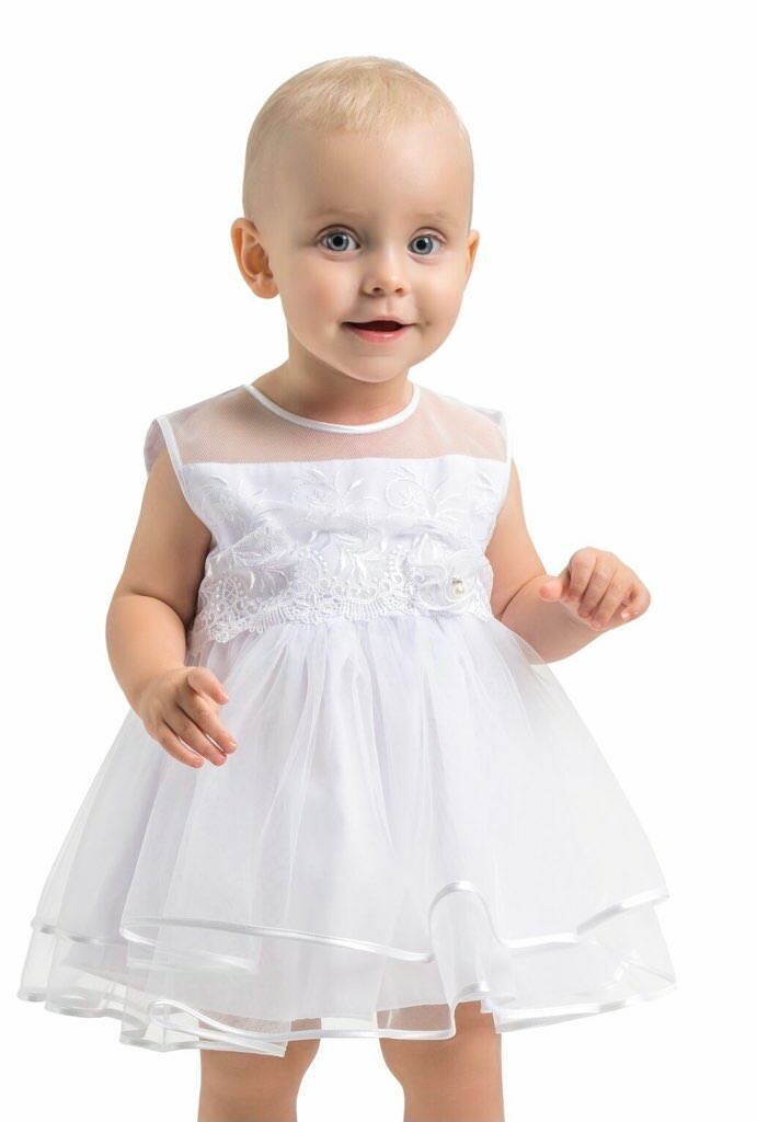Biała sukienka na chrzest bez rękawów. Posiada bawełnianą podszewkę, koronkową górę z przyszytym kwiatem. Dół składa się z falowanego tiulu zakończonego lamówką. Sukienka zapinana na zamek i wiązana na tylną kokardkę. Polska produkcja. Standardowe rozmiary, 68 – 92.