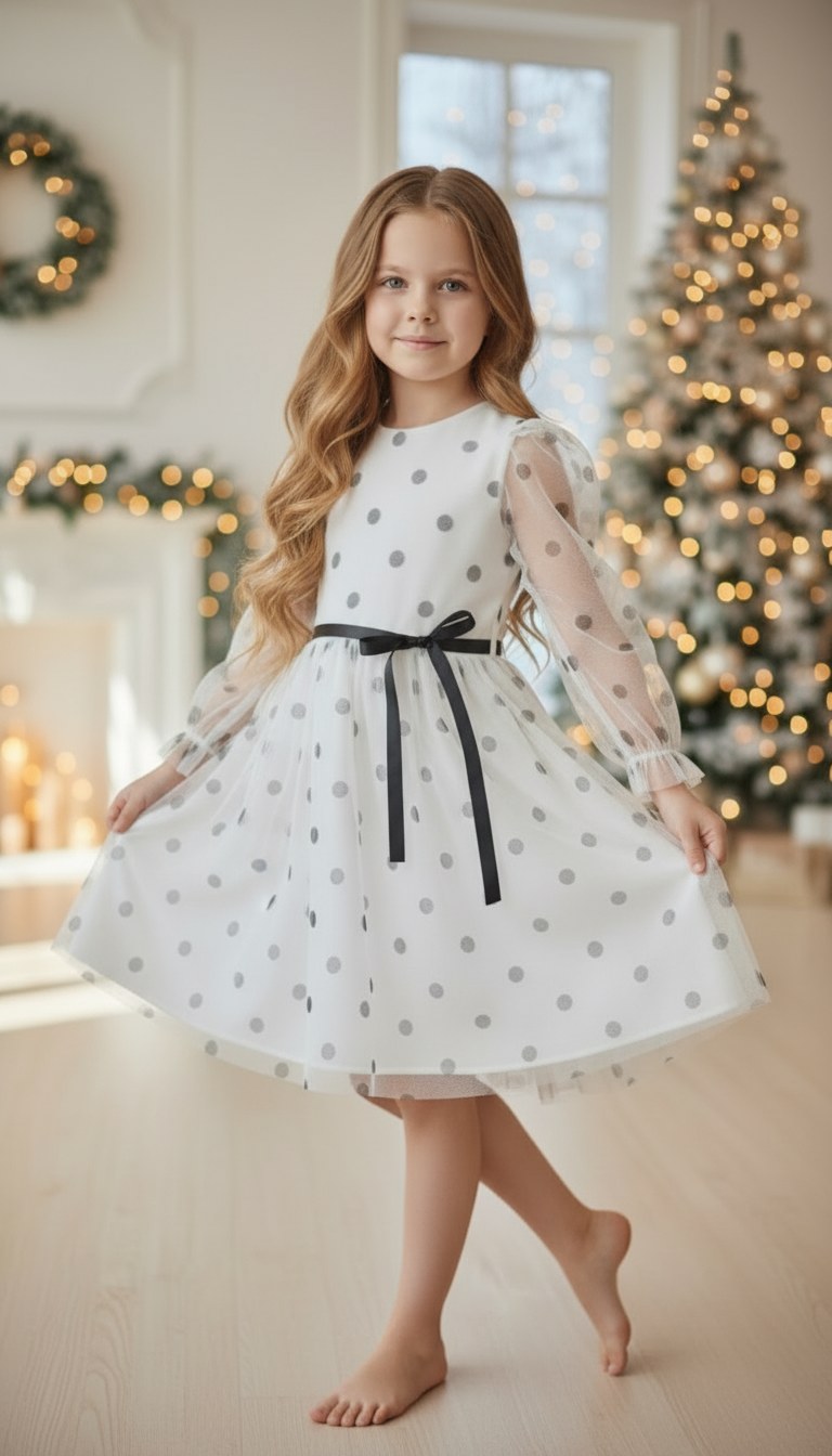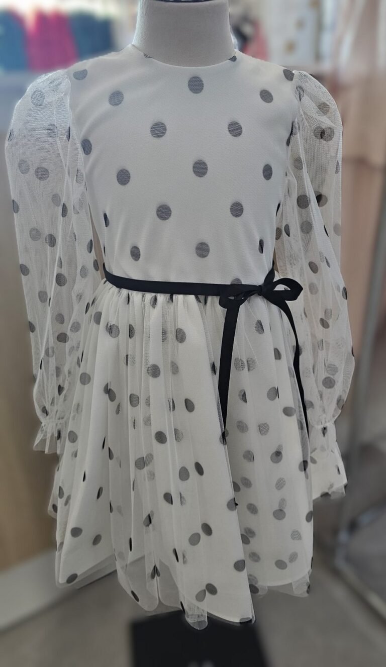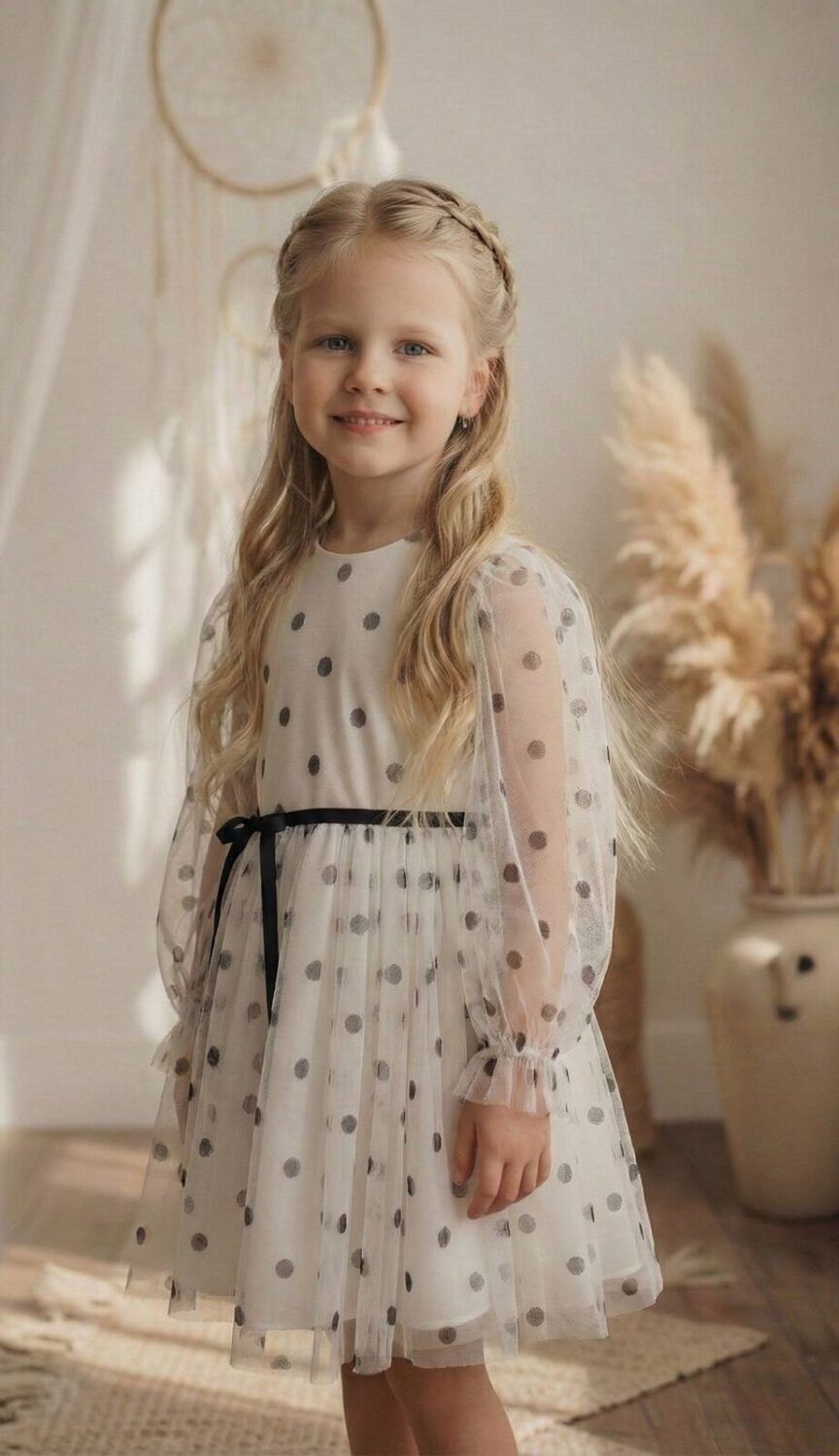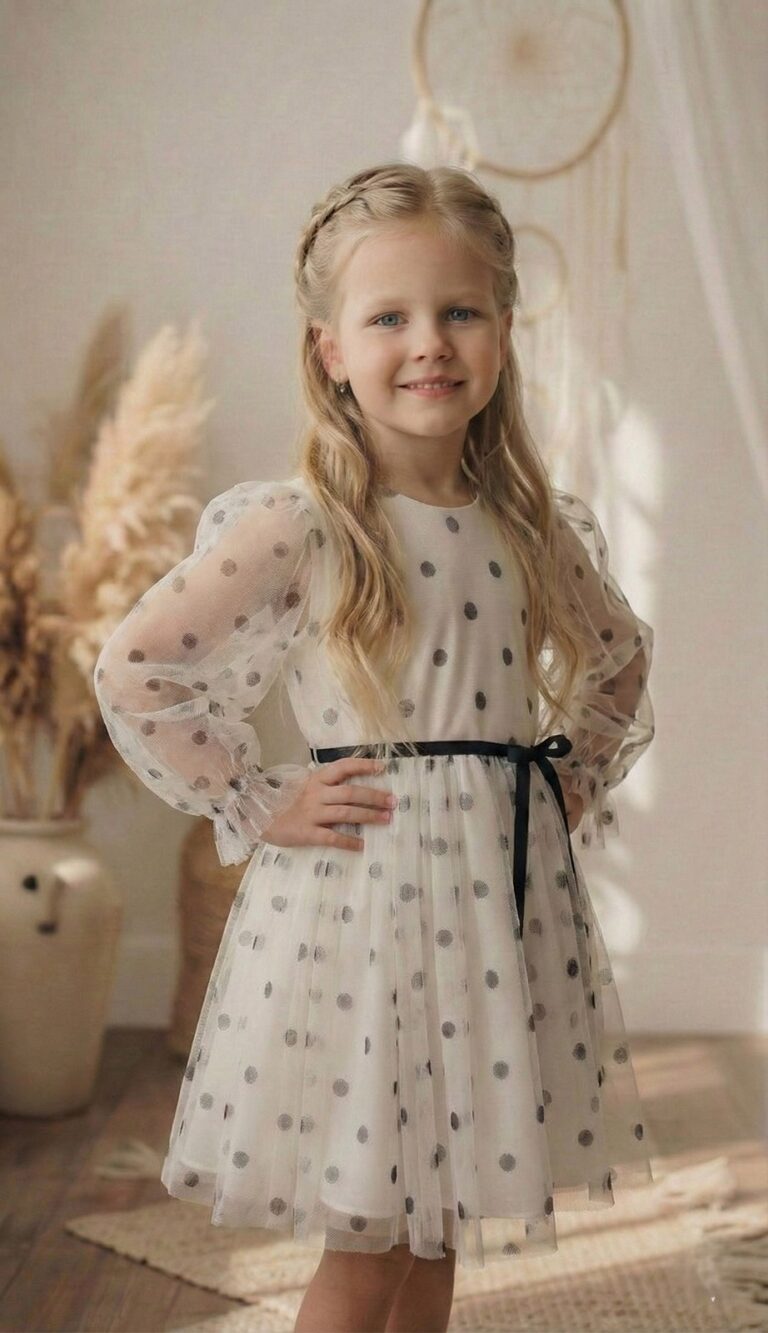 Ta sukienka to doskonały wybór dla dziewczynek, które lubią klasyczne wzory z nutą nowoczesności. Biały materiał połączono z przezroczystymi rękawami, które dodają lekkości i delikatności całej stylizacji.