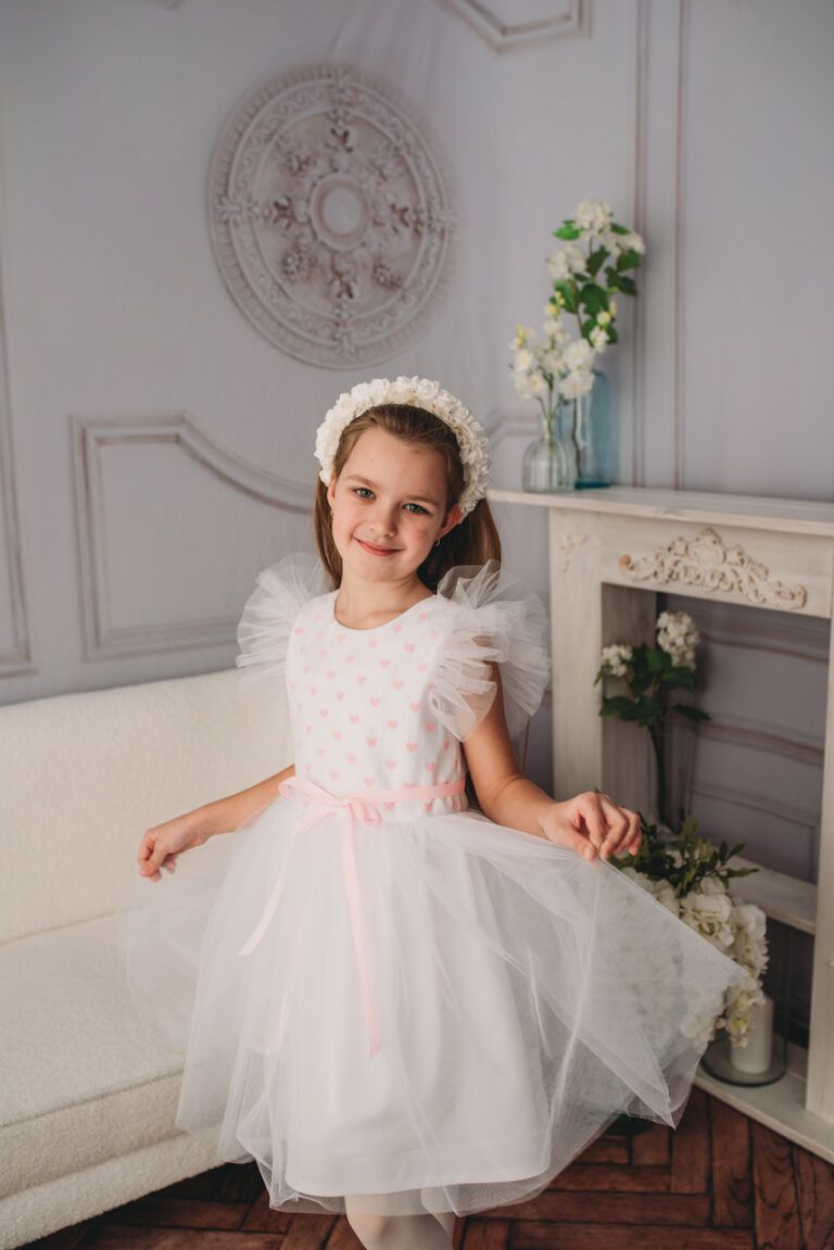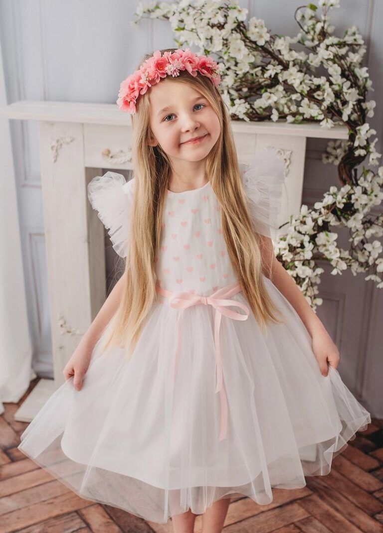 Bawełniana podszewka oraz tiulowy materiał zapewniają wygodę na cały dzień. Słodkie serduszka nadrukowane w górnej części i różowe detale sprawiają, że sukienka jest idealna na szczególne okazje i przypadnie do gustu małym dziewczynkom.