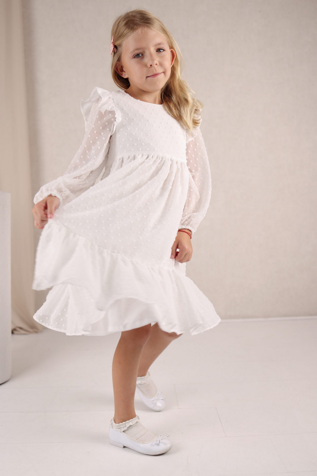 Ta biała sukienka z tkaniny plumeti to propozycja pełna delikatności i dziewczęcego uroku. Lekka, ozdobiona drobnymi groszkami tkanina oraz rozkloszowany fason sprawiają, że świetnie sprawdzi się podczas wyjątkowych uroczystości, zapewniając komfort i swobodę ruchów.