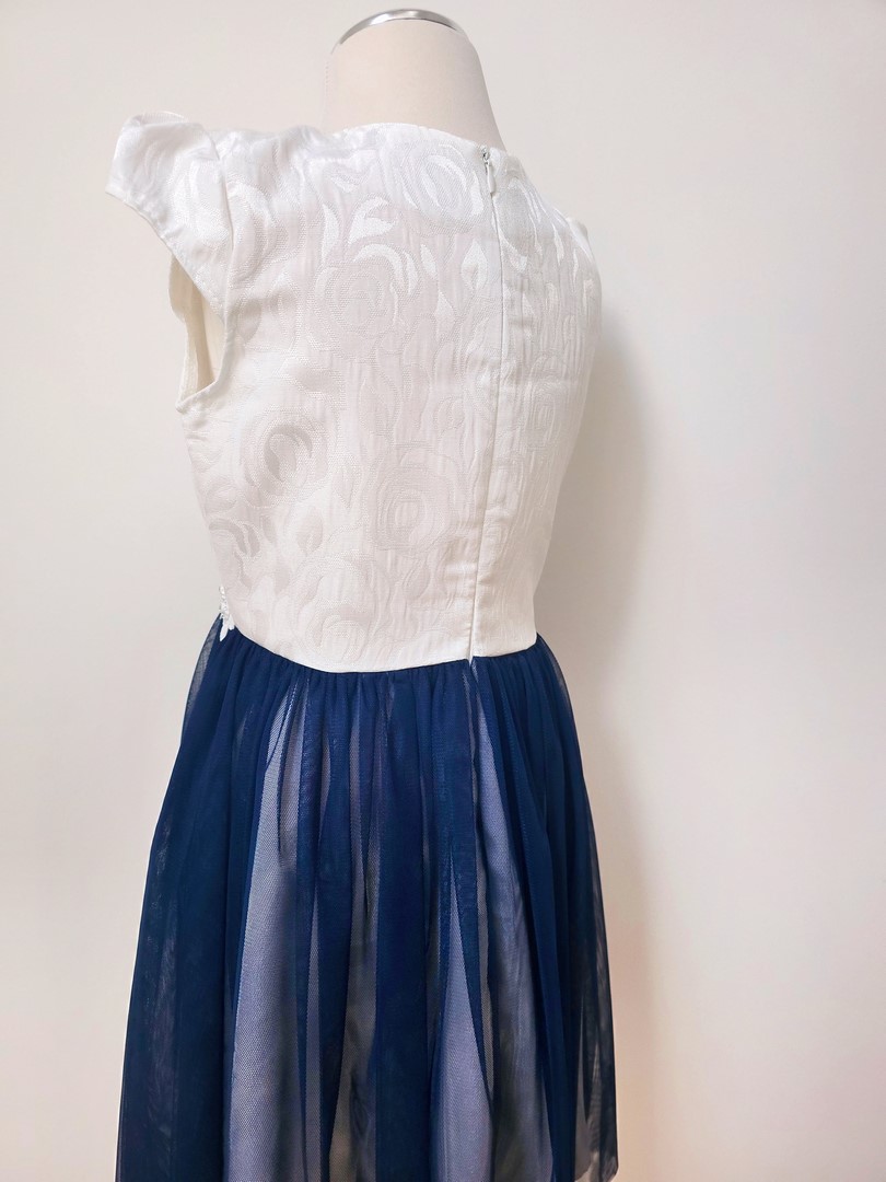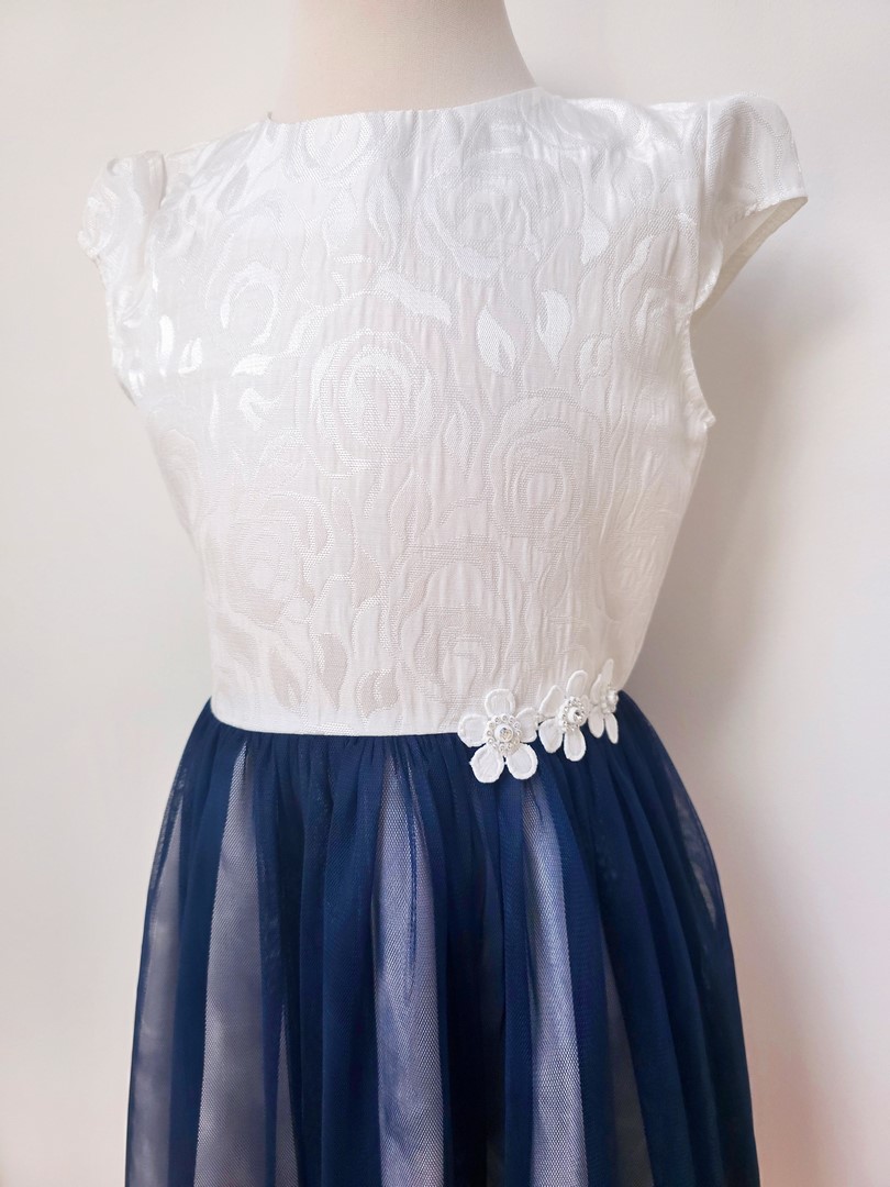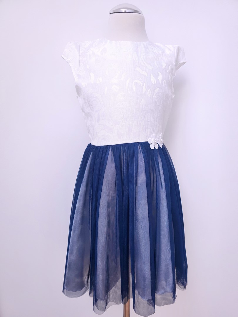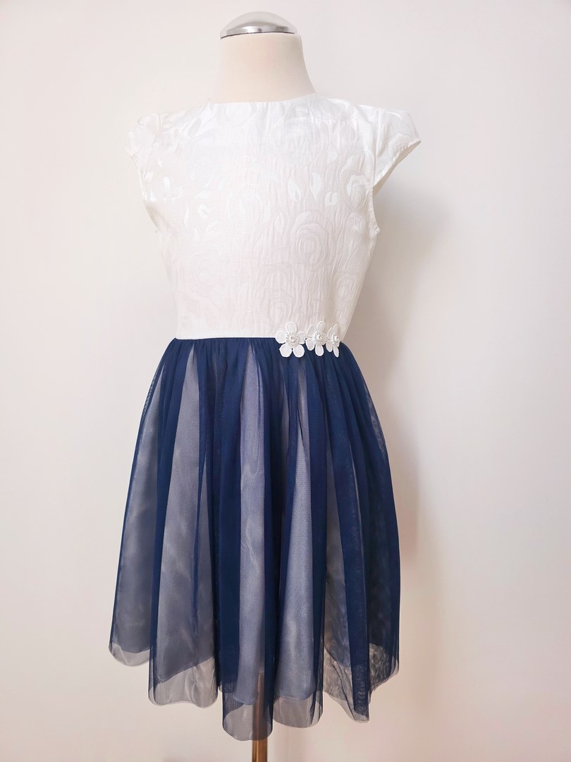 Sukienka wizytowa dla starszej dziewczynki, od 7 do 14 lat. Klasyczny wzór przyozdobiony ozdobnymi perełkami w talii i przy szyi. Sukienka zapinana na kryty, tylny zamek. Wygoda i elegancja w jednej kreacji. Idealna na takie wydarzenia jak rozpoczęcie roku czy święta. Polska produkcja. Rozmiary 128 – 152