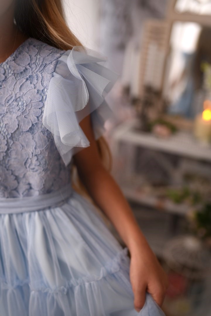 Przepiękna, polska sukienka w kolorze błękitu, wykonana z delikatnych i miękkich tkanin. Idealna na specjalne okazje, dzięki wyjątkowym detalom, takim jak tiulowe falbanki i elegancki krój. Góra sukienki ozdobiona koronką, a tył wycięty w kształt litery V, co dodaje całości szyku i wyjątkowego charakteru.