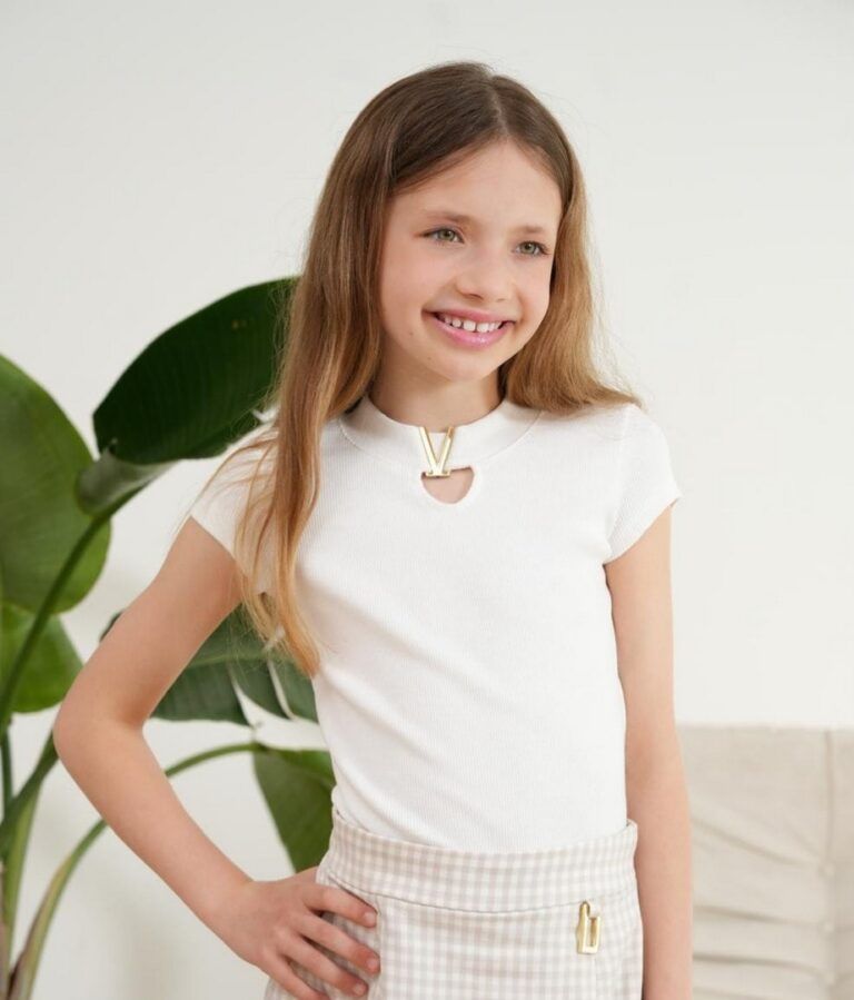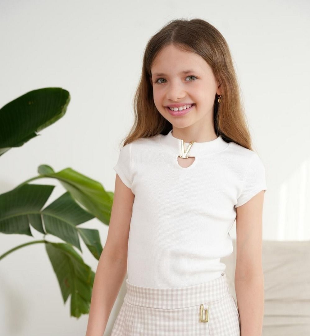 Miękka, elastyczna bluzka z krótkim rękawem to świetna baza do codziennych i bardziej odświętnych stylizacji. Jasny kolor ecru oraz złota aplikacja przy dekolcie dodają jej dziewczęcego uroku i sprawiają, że wyróżnia się wśród klasycznych modeli.