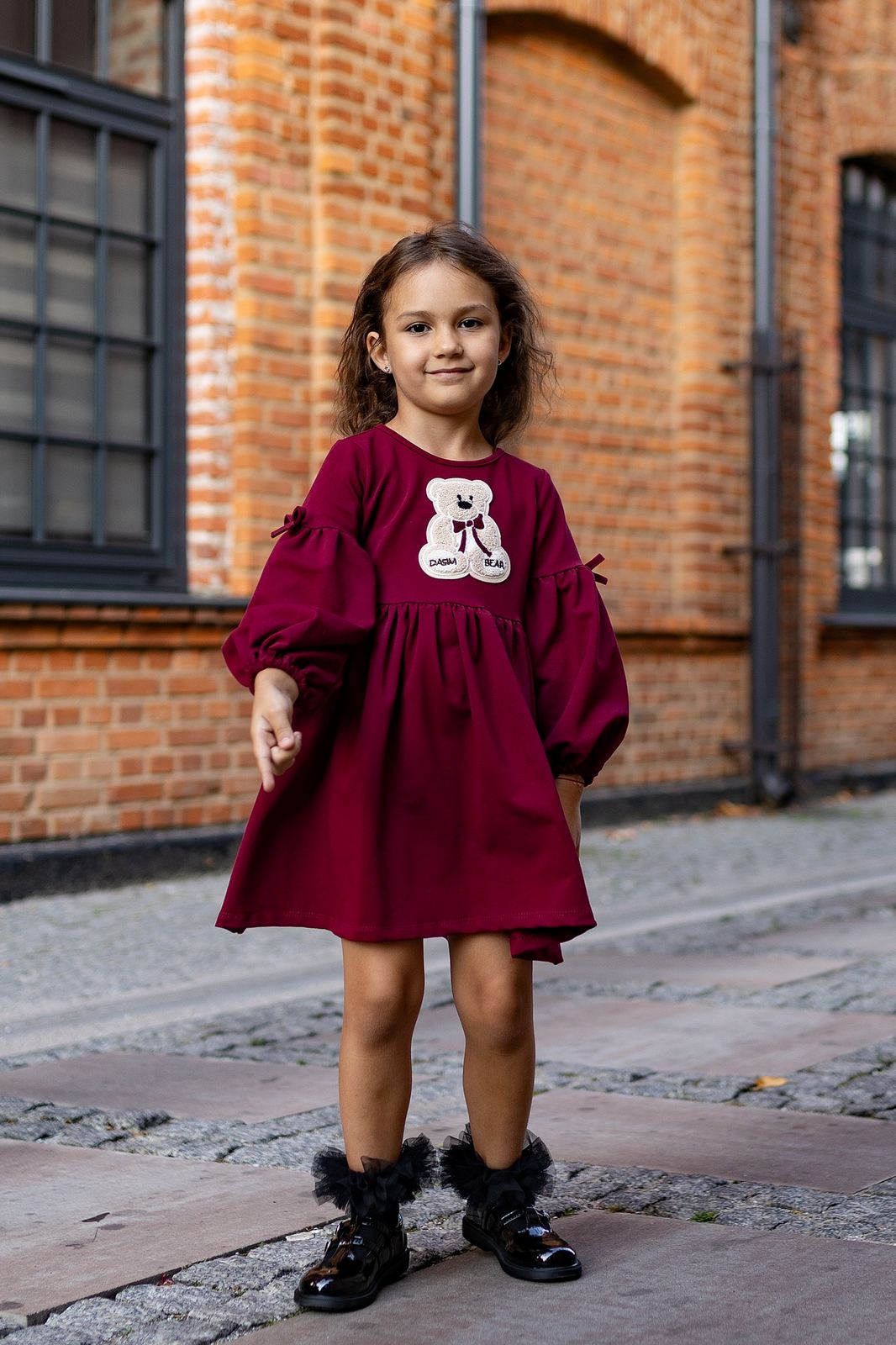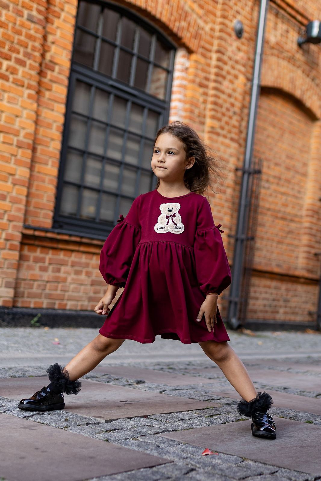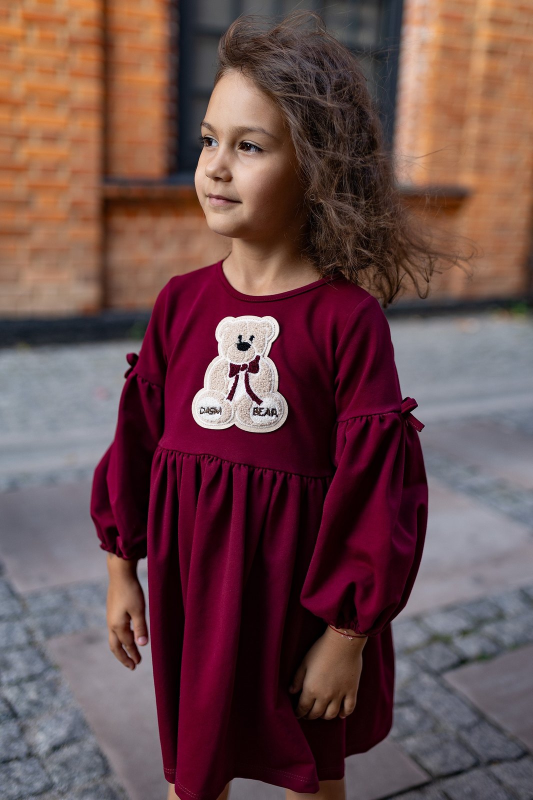 bordowa sukienka z bawełny dla dziewczynek w wieku od 3 do 9 lat. Biała aplikacja misia w centralnej części sukienki i piekne bufiaste rękawy przyciągają uwagę i sprawiają, że sukienka staje się nie całkiem zwyczajna.