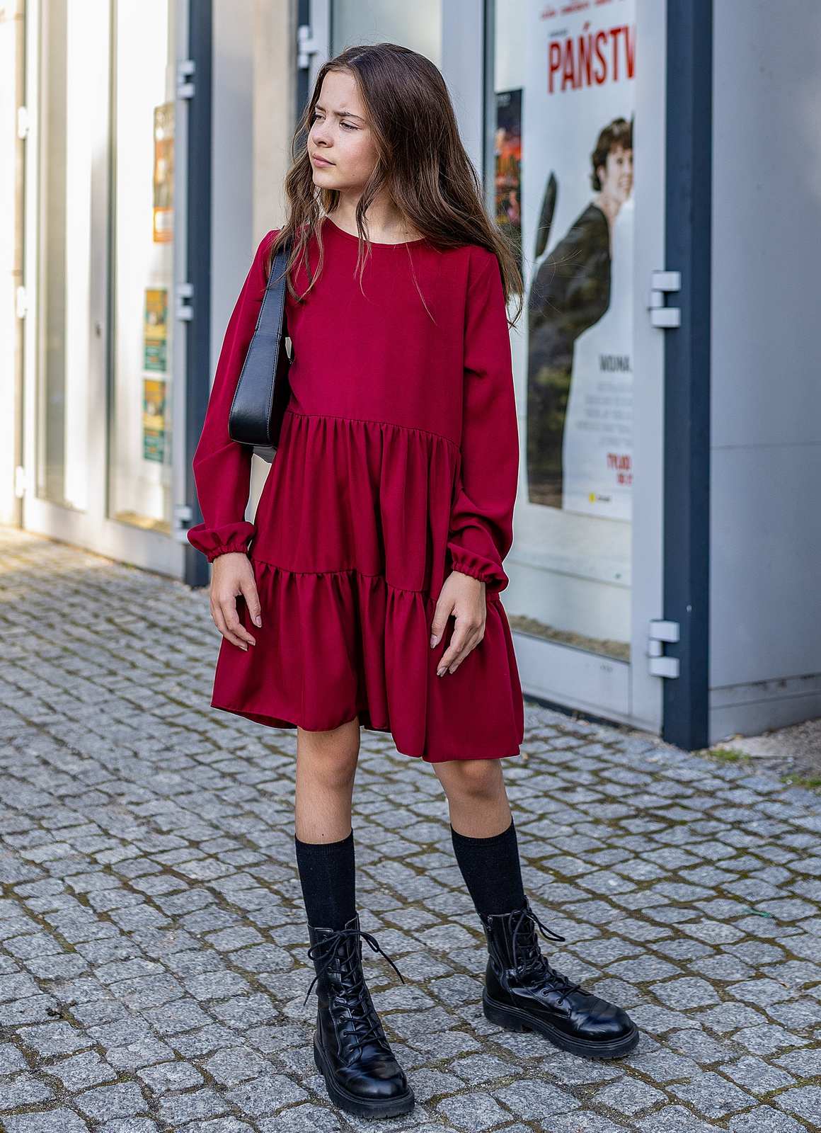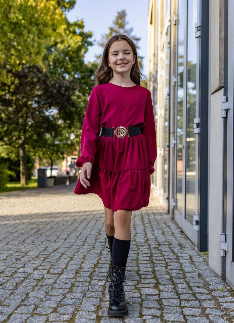 Do bordowej sukienki warto dobrać klasyczne baleriny lub botki oraz delikatne rajstopki. Pasek można zawiązać na kokardę, co doda stylizacji dziewczęcego uroku. Idealnym dopełnieniem będą proste dodatki, takie jak opaska do włosów lub subtelna biżuteria.