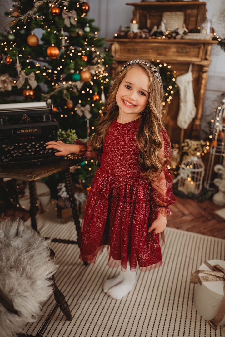 Przedstawiamy bordową sukienkę dla dziewczynki, wykonaną z połyskującego tiulu, która idealnie wpisuje się w styl księżniczki. Subtelna elegancja i dziewczęcy urok czynią ją doskonałym wyborem na wyjątkowe świąteczne czy sylwestrowe okazje.
