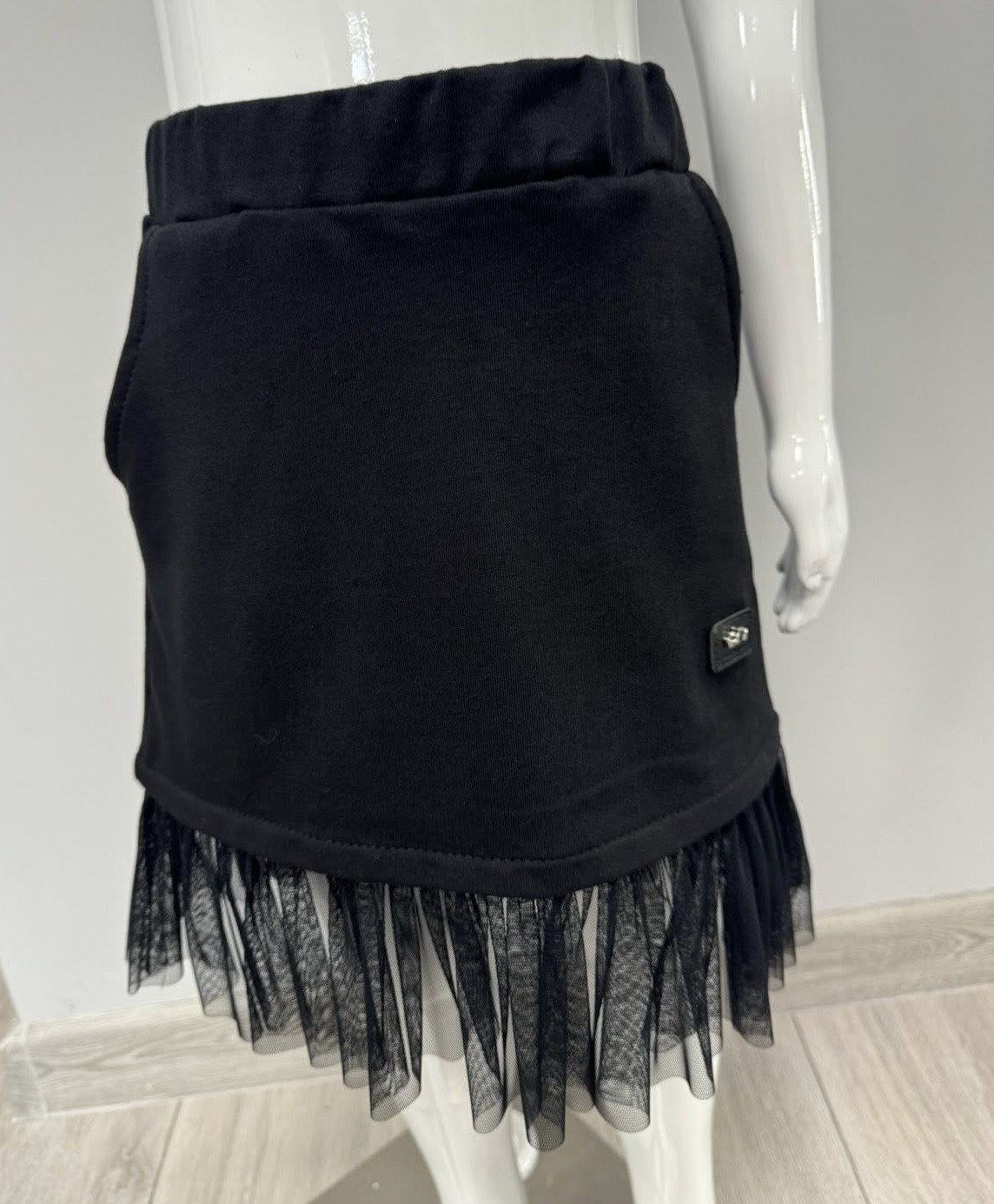 Czarna spódnica wykonana z bawełny, z delikatnym tiulem na zakończeniu, sprawdzi się zarówno na co dzień, jak i podczas wyjątkowych okazji. Praktyczne boczne kieszenie oraz elastyczna guma w pasie zapewniają swobodę ruchów i łatwość zakładania.