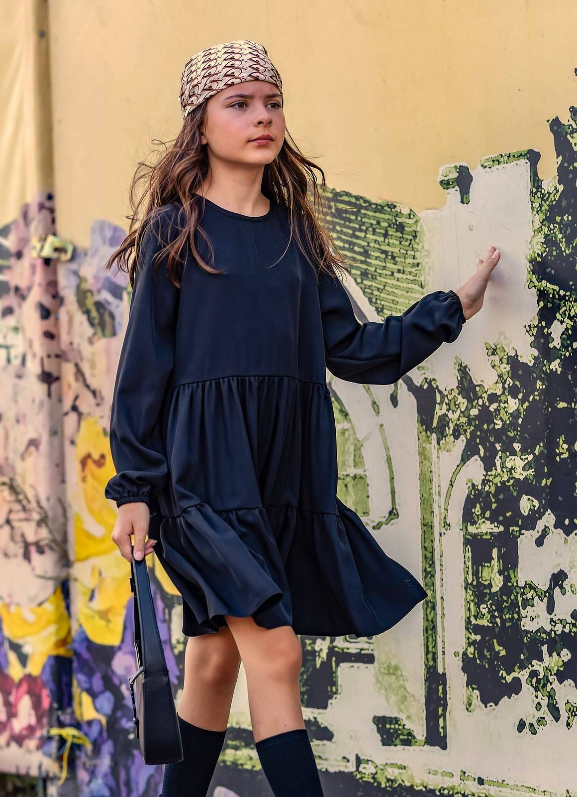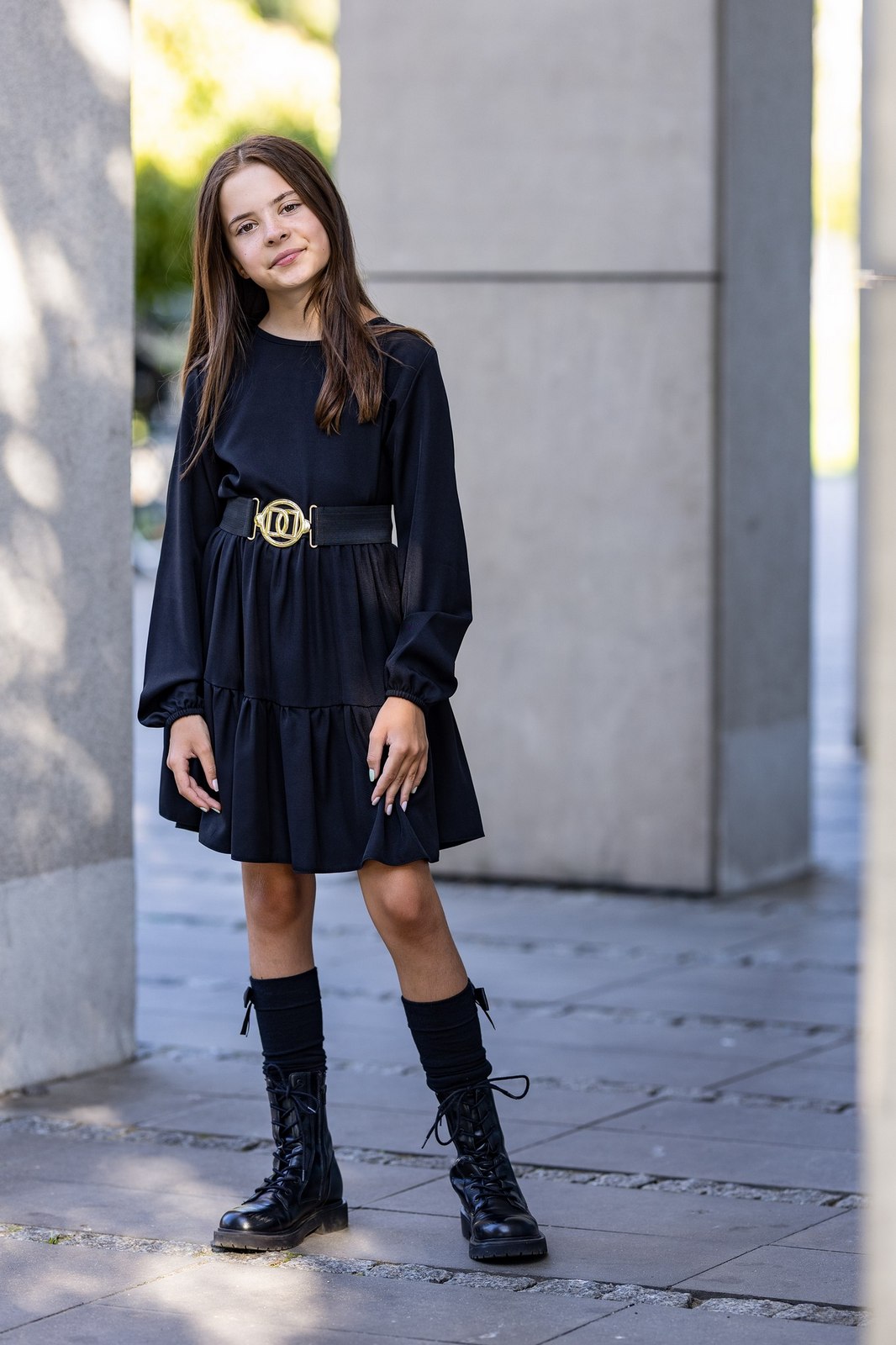Ta czarna, luźna sukienka z paskiem to doskonała propozycja na wiele okazji. Jej uniwersalny krój sprawia, że sprawdzi się zarówno na co dzień oraz szkolnych uroczystości. Pasek pozwala na subtelne podkreślenie talii, dodając stylizacji lekkości i oryginalności.