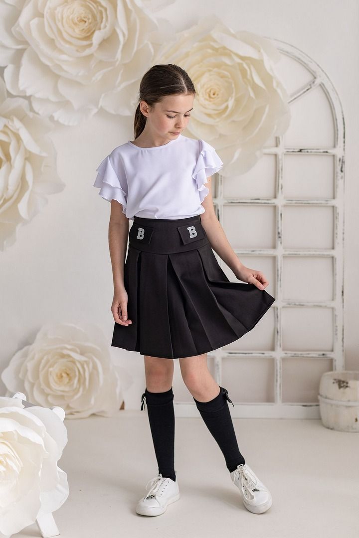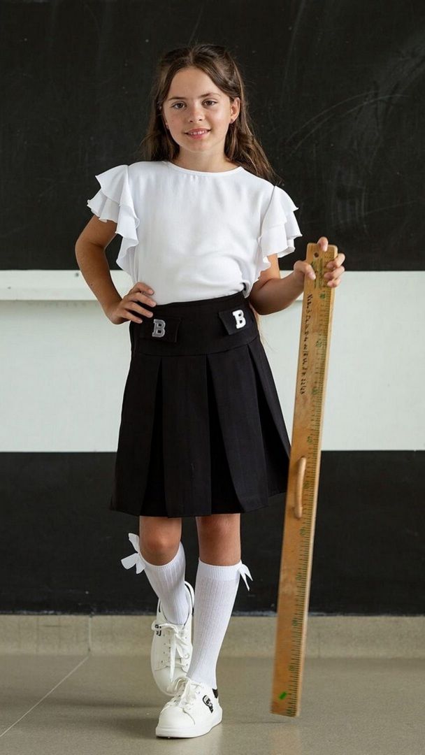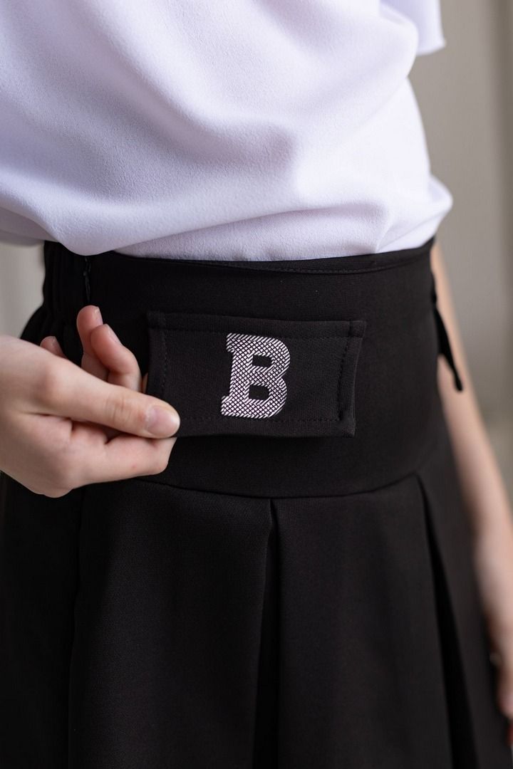 Czarna plisowana spódnica to uniwersalny wybór do szkolnych stylizacji oraz oficjalnych wyjść. Model przed kolano zachwyca prostą formą, a delikatny połysk srebrnych liter B dodaje całości nowoczesnego charakteru. Spódnica sprawdzi się zarówno na co dzień, jak i podczas ważnych uroczystości szkolnych.