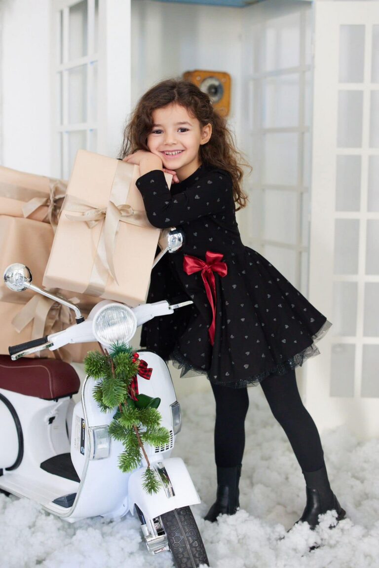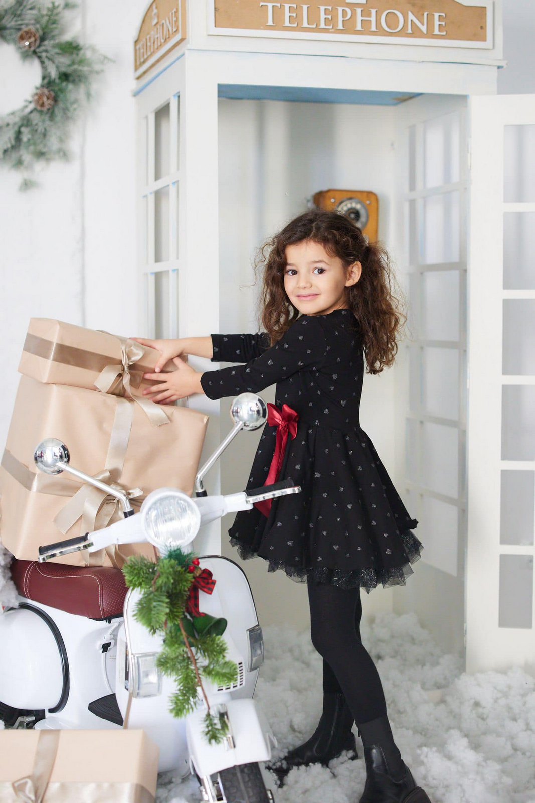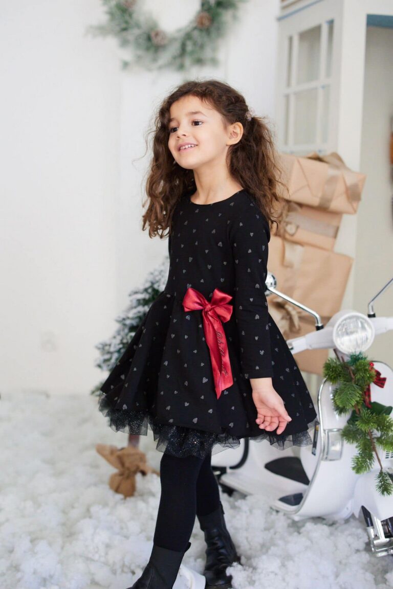 Sukienka stworzona z myślą o światecznych sesjach i spotkaniach przy choince. Połączenie welurowej góry z satynowym dołem otoczonym tiulem w kropki nadaje całości wyjątkowego charakteru, a złota kokarda w pasie dodaje subtelnego blasku.
