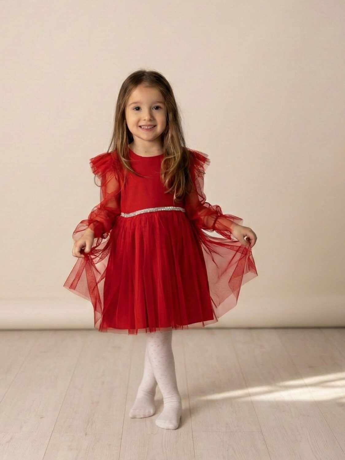 Świąteczna sukienka w soczystej czerwieni, która z pewnością przyciągnie uwagę na każdym przyjęciu. Sukienka łączy elegancję i delikatność dzięki satynowej podszewce oraz tiulowemu dołowi, nadając kreacji subtelny urok. Rękawy z tiulowymi motylkami i piórkami oraz zakończone gumką dodają lekkości i dziewczęcego wdzięku. W pasie znajduje się pasek ozdobiony cyrkoniami, który podkreśla talię i dodaje blasku. Z tyłu sukienka zapinana jest na długi, kryty zamek, co zapewnia wygodę noszenia. Idealna propozycja na święta i wyjątkowe okazje. Produkt polski, dostępny w rozmiarach od 92 do 128.