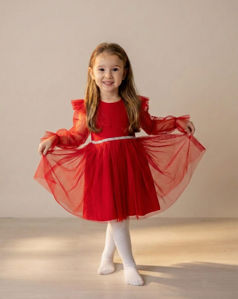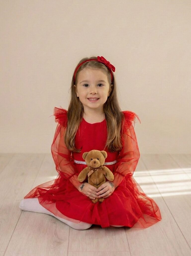 Ta wyjątkowa czerwona sukienka z strusimi piórami to idealny wybór na świąteczne spotkania i sesje zdjęciowe, dodając każdej małej damie elegancji i odrobiny magicznego blasku.