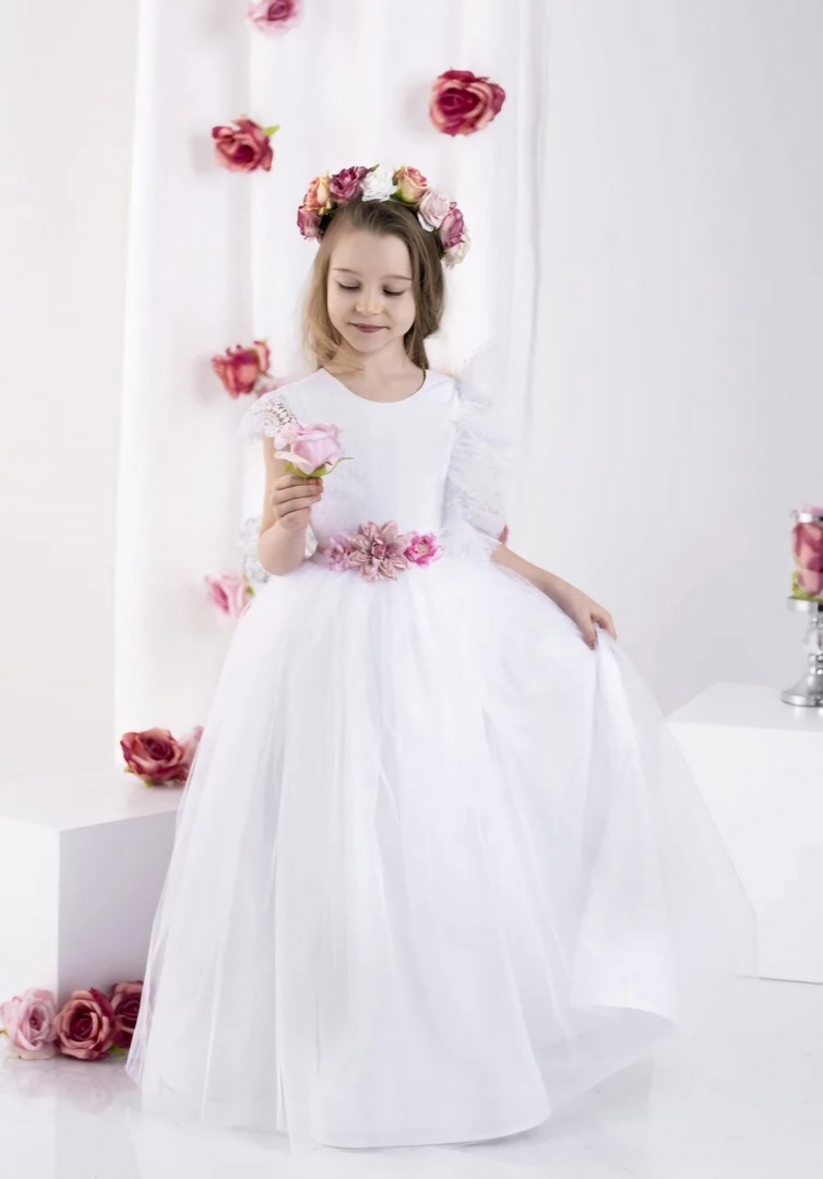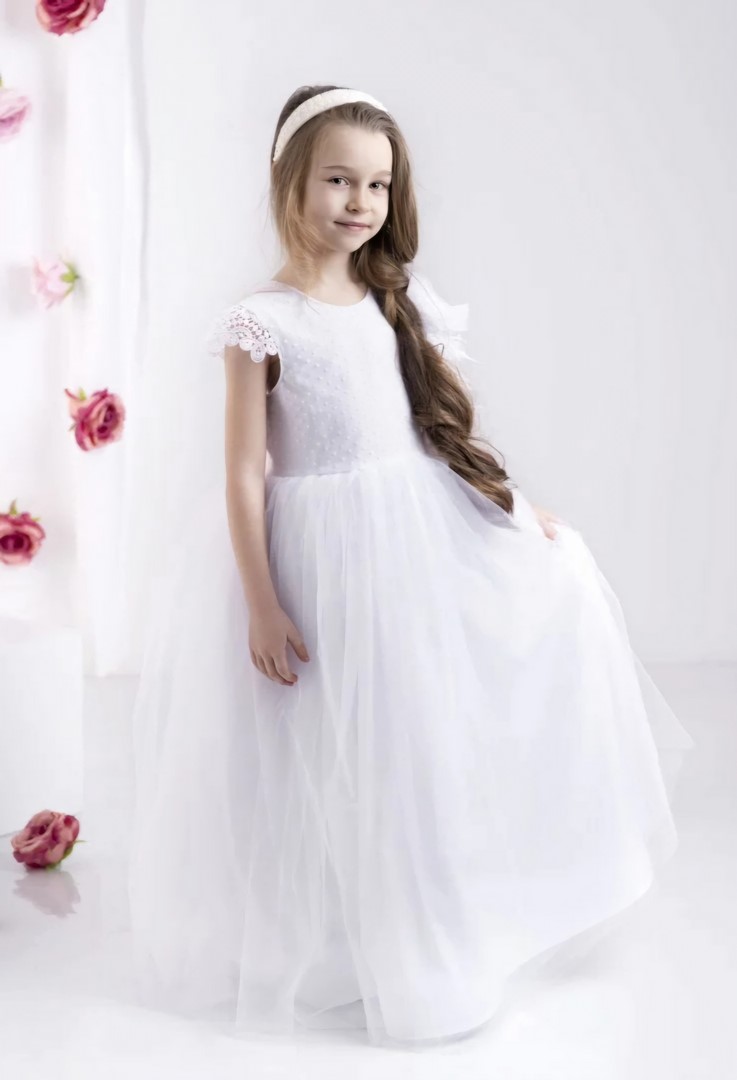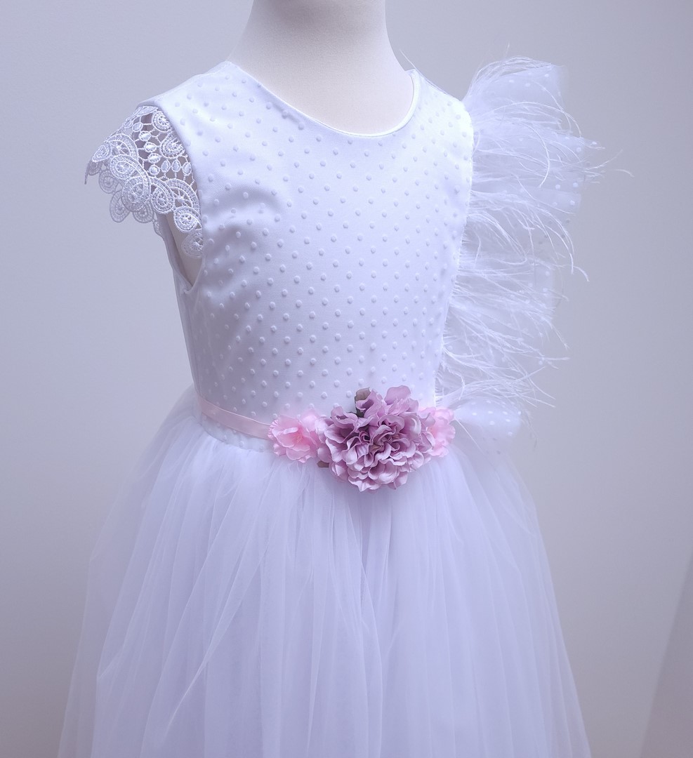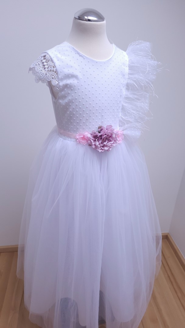 Opisana suknia to biała kreacja, idealna na uroczystość Pierwszej Komunii Świętej. Suknia wykonana jest z dbałością o szczegóły i charakteryzuje się delikatnym, ale jednocześnie efektownym designem. Góra sukni pokryta jest tiulem w kropki, co nadaje jej subtelnego uroku. Krótkie rękawki wykonane są z koronki, która dodaje sukni romantycznego stylu. Jednak to pionowa aplikacja z tiulu i piór, umieszczona w górnej części sukienki, wyróżnia tę kreację i dodaje jej niepowtarzalnego charakteru. Suknia posiada opcjonalny pasek z kwiatów, który wiązany jest w tylnej części sukni. Cała kreacja jest lekka jak piórko, dzięki czemu młoda dama może czuć się w niej wygodnie i swobodnie. Suknia sięga do kostek, co nadaje jej eleganckiego wyglądu. Dodatkowo spód sukni pokryty jest bawełnianą podszewką, co sprawia, że noszenie jej jest jeszcze bardziej przyjemne. Jest to kreacja, która z pewnością przyciągnie uwagę i sprawi, że każda młoda dama poczuje się wyjątkowo w tym ważnym dniu. Polska produkcja. rozmiar 128 – 158.