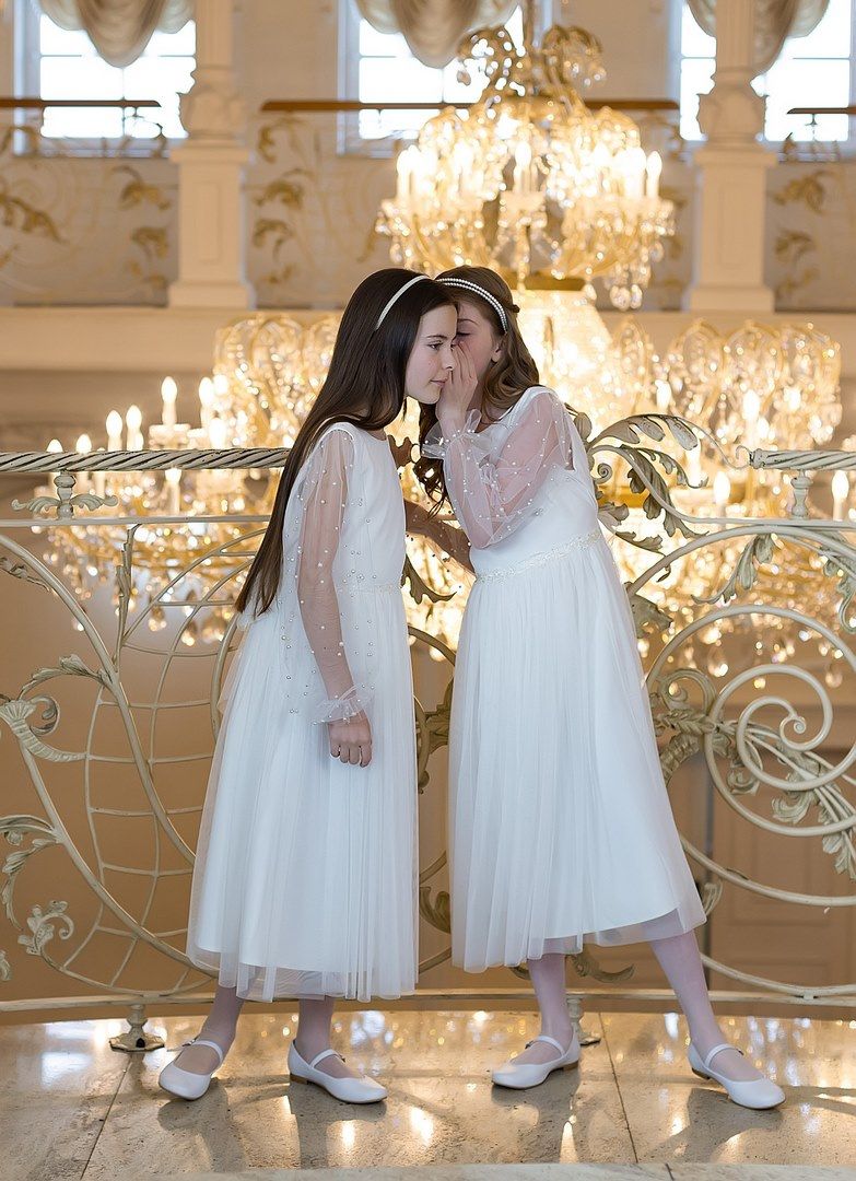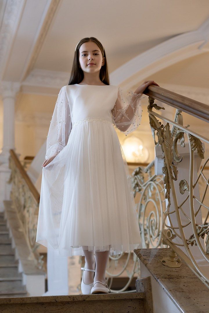 Delikatna sukienka w kolorze subtelnej śmietanki, idealna na uroczystość Pierwszej Komunii Świętej. Klasyczna i elegancka, z nowoczesnymi akcentami, które dodają wyjątkowego uroku każdej dziewczynce.
