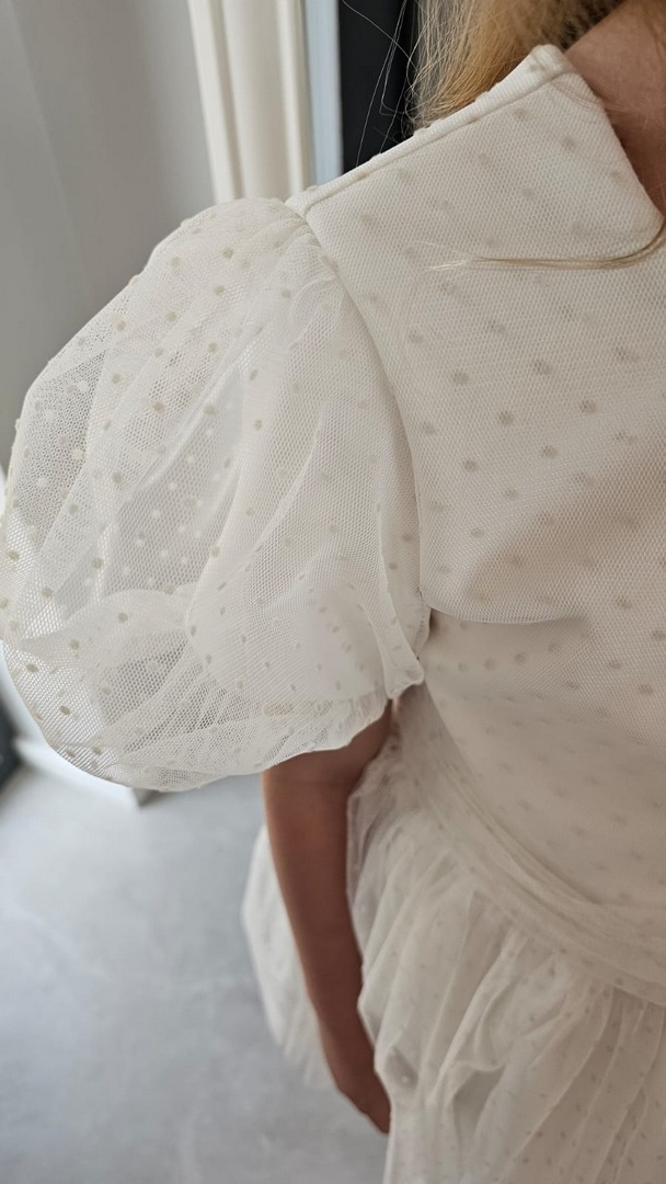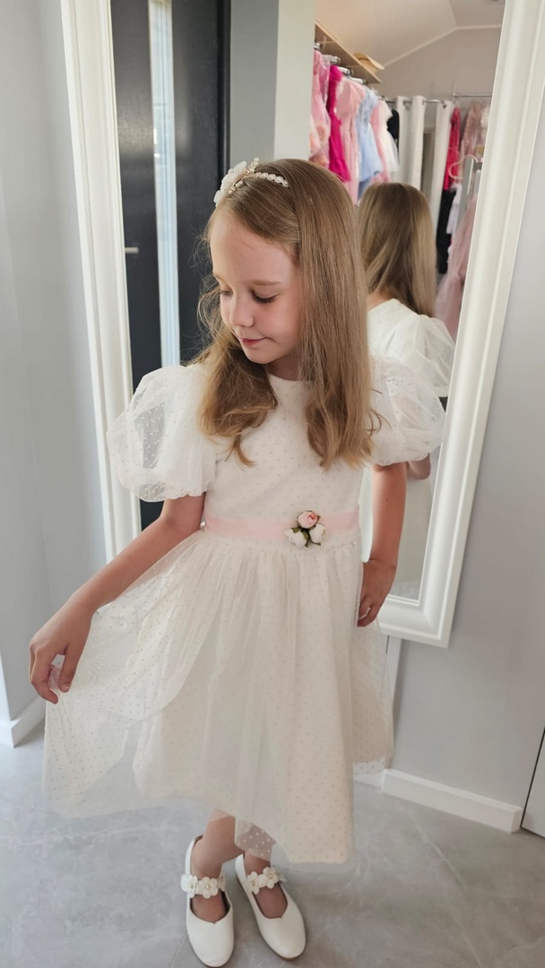 - Elementy: bufki na rękawach, do wyboru wstążka z kwiatami lub tiulowy pasek
