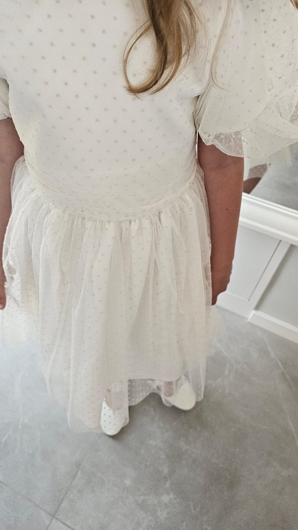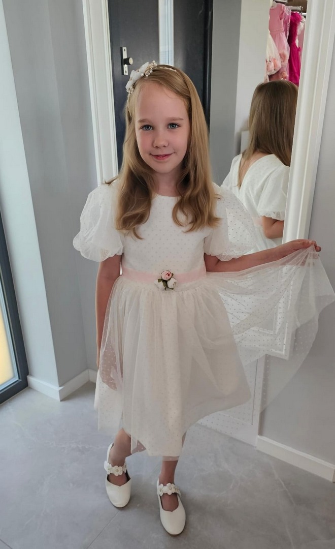 Delikatna, a zarazem efektowna – ta sukienka w kolorze ecru w złote kropki to idealna propozycja dla dziewczynek na wyjątkowe okazje. Lekki tiul nadaje jej lekkości i dziewczęcego uroku, a starannie dobrane dodatki pozwalają dopasować stylizację do charakteru wydarzenia.