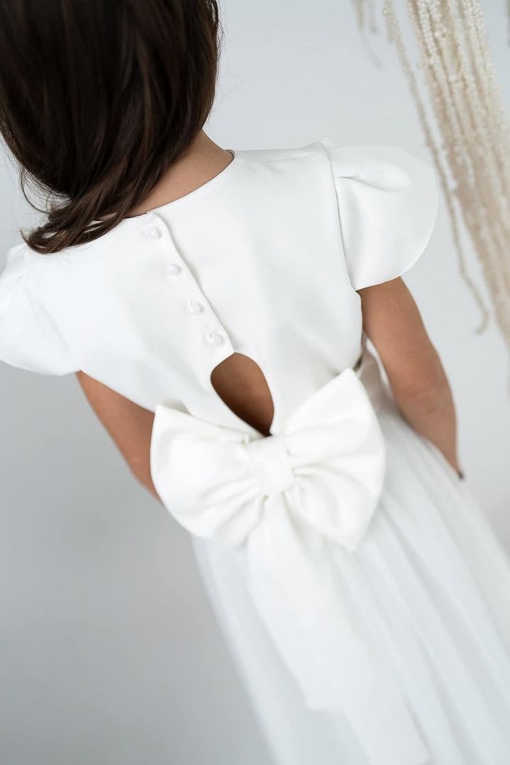 Elegancka sukienka w odcieniu ecru to doskonały wybór na wyjątkowe okazje. Połączenie klasycznego kroju z nowoczesnymi detalami sprawia, że kreacja prezentuje się niezwykle stylowo i dziewczęco. Delikatne bufiaste rękawki, tiulowy dół oraz efektowna kokarda nadają jej niepowtarzalnego uroku.