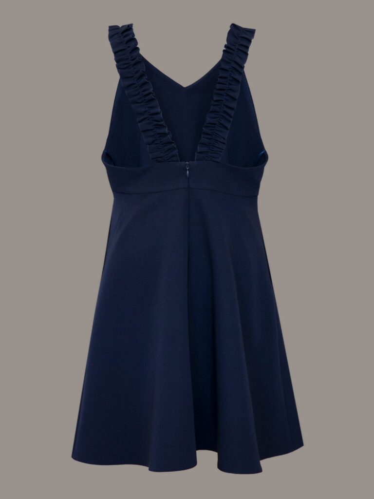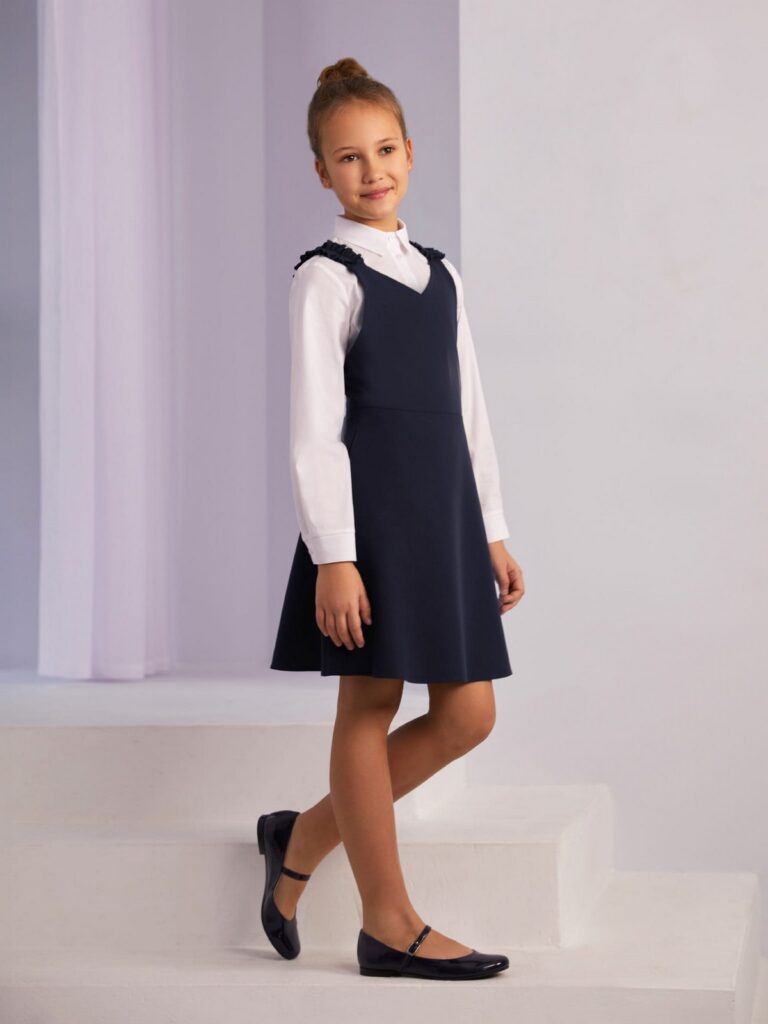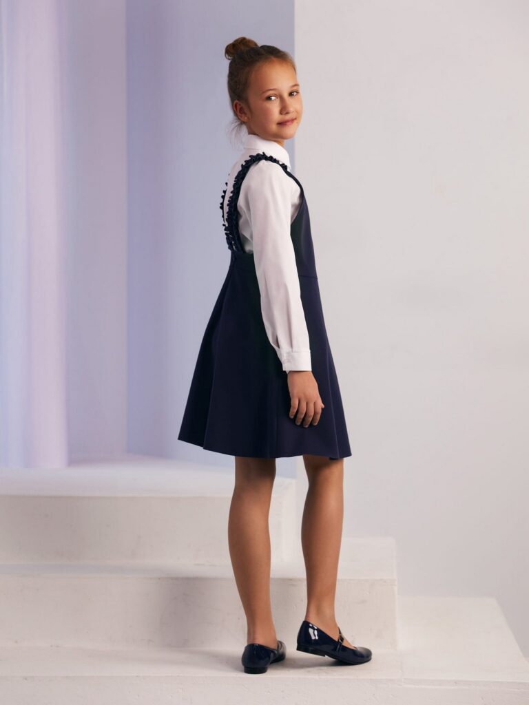 Granatowa sukienka z falbankowymi szelkami to propozycja, która łączy w sobie praktyczność i dziewczęcy urok. Rozkloszowany krój oraz długość do kolan sprawiają, że idealnie sprawdzi się zarówno na co dzień, jak i podczas ważniejszych wydarzeń szkolnych.