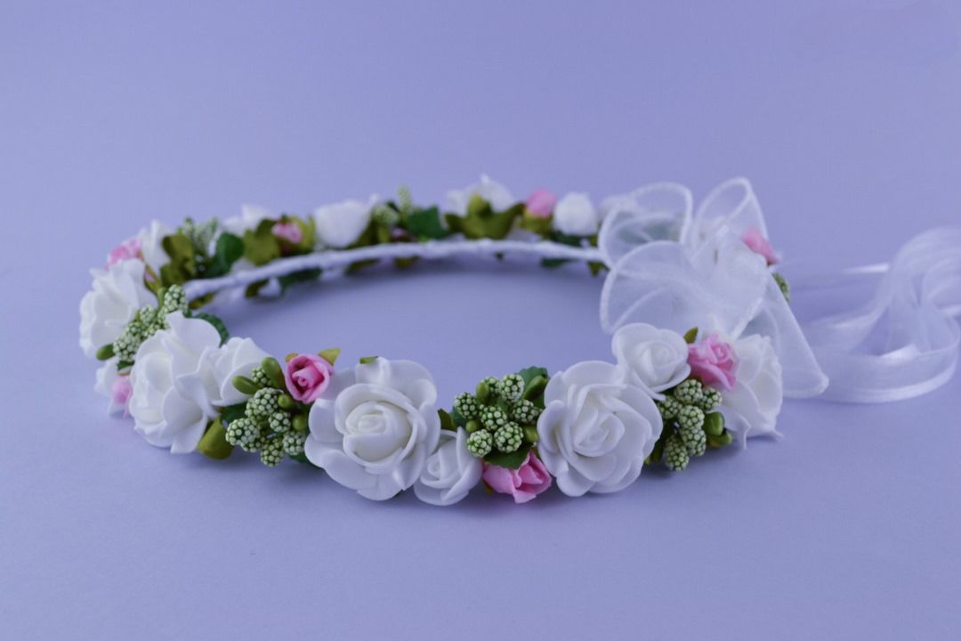 Ten klasyczny wianek komunijny łączy elegancję białych róż z subtelnymi akcentami różowych pączków kwiatowych. Zielone listki dodają naturalnego uroku, a dekoracyjna kokarda z tiulu podkreśla delikatność całości. Idealny wybór na uroczystości komunijne, wprowadzający harmonię i dziewczęcy wdzięk.
