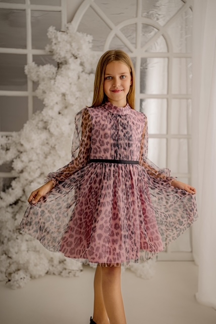 Ta sukienka z kolorowym panterowym printem to doskonała propozycja dla dziewczynek, które lubią wyraziste wzory i dziewczęcy styl. Różowa baza w połączeniu z tiulowymi rękawami tworzy modną i lekką stylizację, idealną na różne okazje.