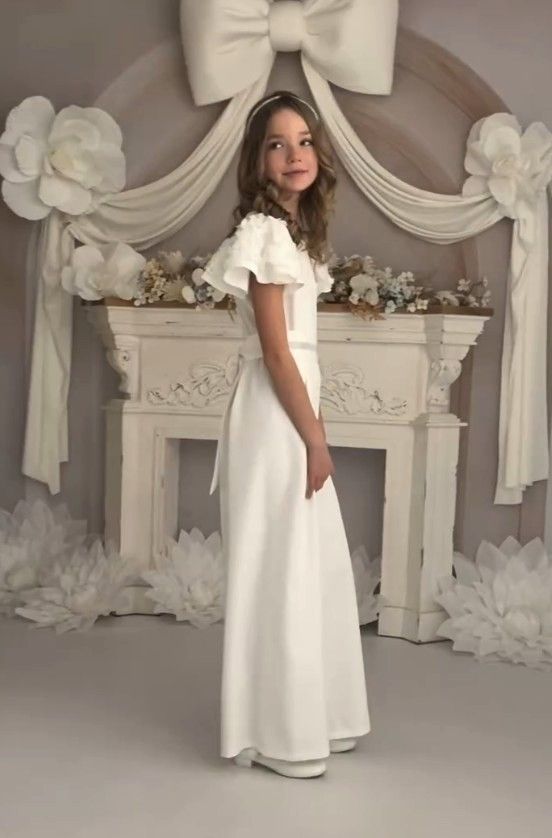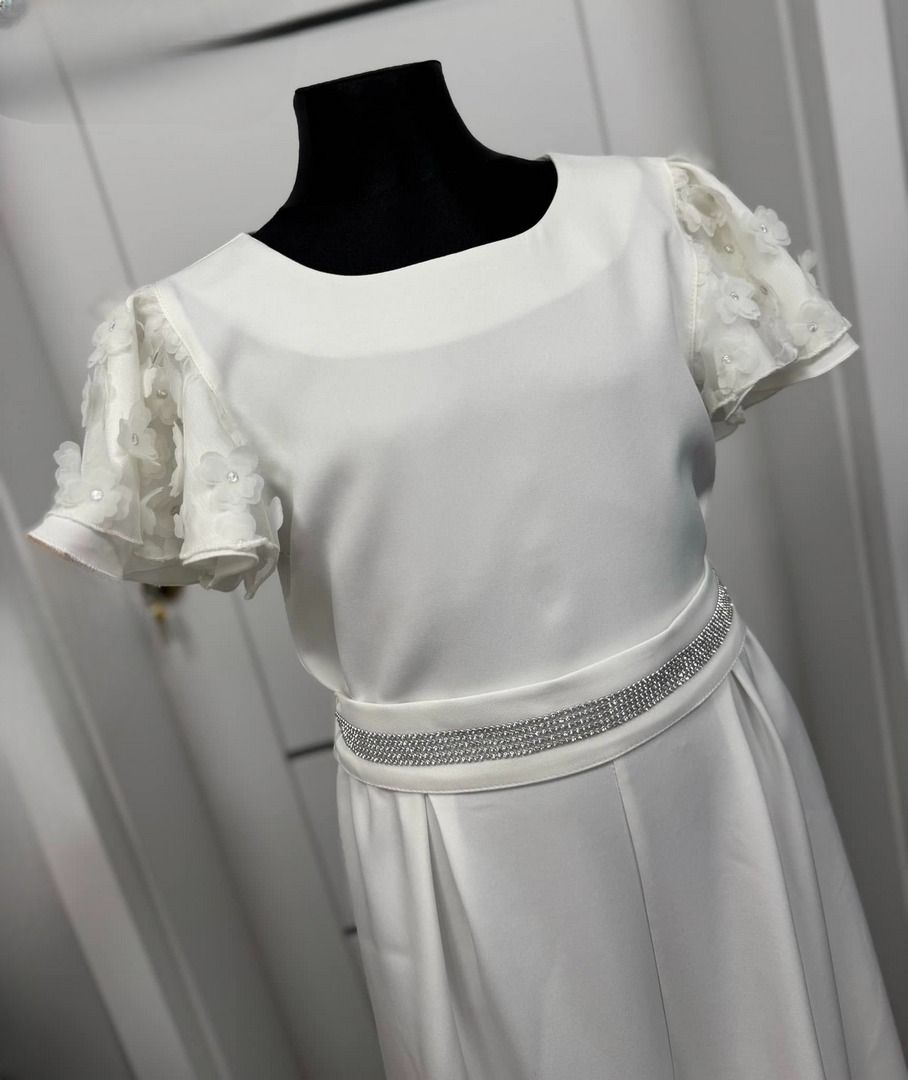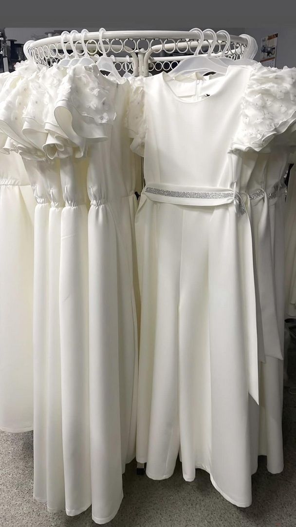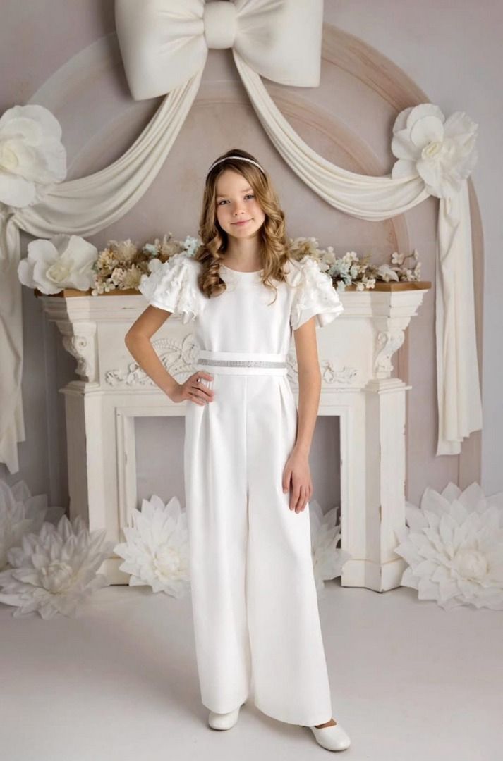 Ten kombinezon to doskonały wybór na przyjęcia komunijne, rodzinne uroczystości czy inne eleganckie okazje. Nowoczesny krój w połączeniu z subtelnymi zdobieniami sprawia, że jest to idealna alternatywa dla tradycyjnych sukienek.