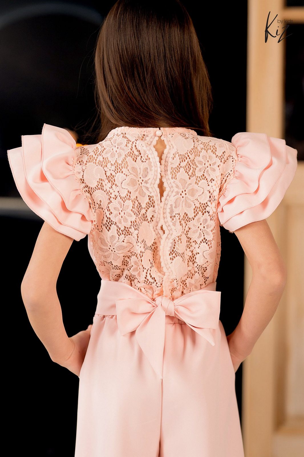 Ten łososiowy kombinezon jest idealnym wyborem na ciepłe dni i wszystkie rodzaje uroczystości. Jego pastelowy odcień dodaje subtelnego szyku, a falowane rękawy i koronkowe detale podkreślają dziecięcy wdzięk.