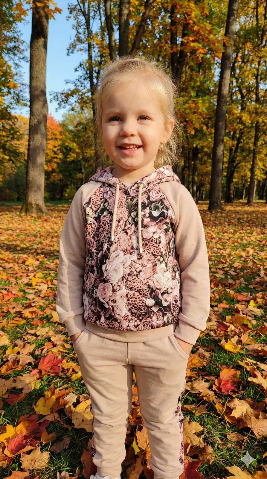Piękny, starannie wykonany komplet dla dziewczynki. Kolor beżowy z pięknymi brązowo kremowymi kwiatami. Wysoka jakość wykonania przez polską firmę. Dresik z najlepszej jakości bawełnianej tkaniny. Kapturek podwójnie obszyty, w tym samym kwiecistym wzorem. Bluza dodatkowo posiada boczne kieszenie. Ściągacze na rękawkach i nogawkach. Spodenki z podwyższonym stanem z wygodna szerszą gumeczka w pasie. Uroku dodają lampasy bo bokach spodni. Dres idealny na jesienne czy zimowe dni, ciepły i wygodny. Dla dziewczynek od 2 do 8 lat. Rozmiary 92, 98, 104, 110, 116, 122, 128.