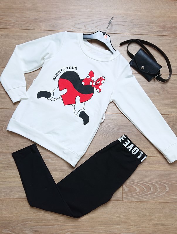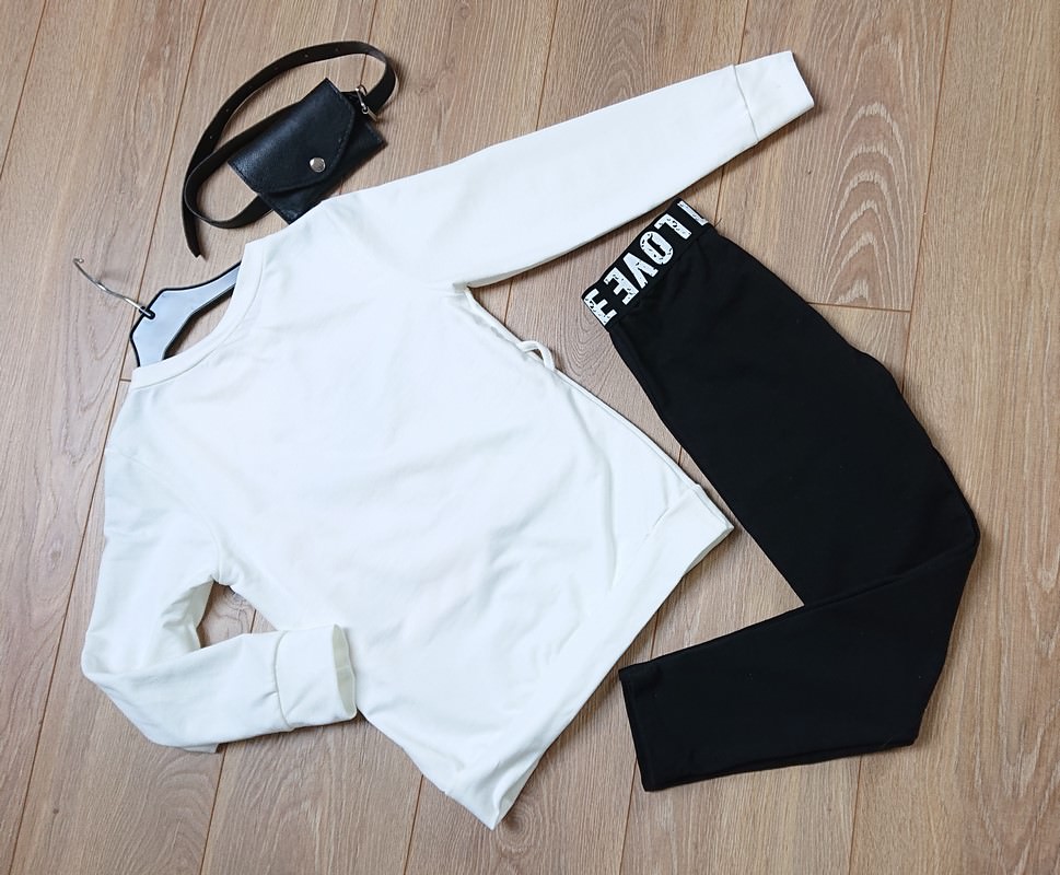 Włoski elegancki komplet składający się z bluzki, spodni delikatnie zwężanych, skórzanego paska z saszetką. Można nosić na wiele sposobów. Bluzka posiada modny wzór. Kostium na każdą porę roku, staranne wykonany. Góra kremowa z czerwono czarnym wzorem. Spodnie czarne z białym napisem w pasie.