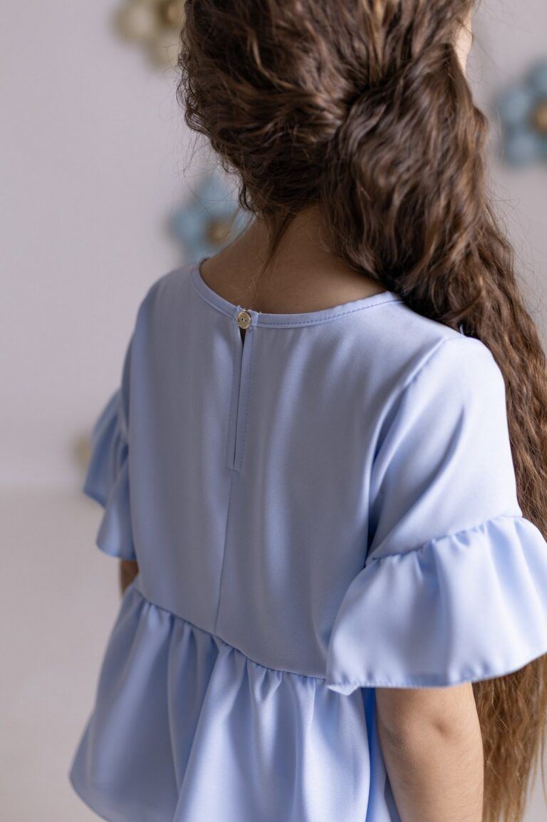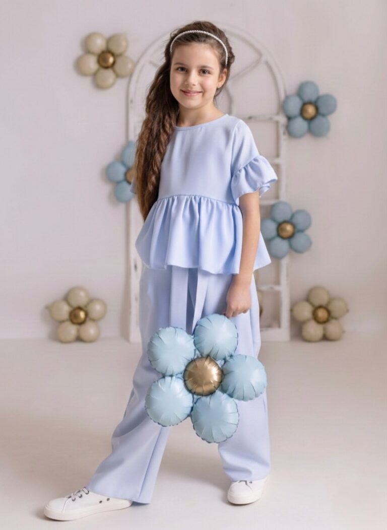 Zadbaj o wygodę i styl swojej córki, wybierając ten niezwykle uroczy komplet składający się z delikatnie rozszerzanej bluzki na krótki rękaw i prostych spodni. Ten zestaw w kolorze niebieskim to idealne rozwiązanie na różne okazje – od codziennego noszenia po bardziej uroczyste chwile.