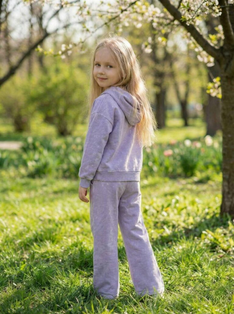 Ten liliowy komplet z bawełny to doskonały wybór na chłodniejsze dni, kiedy liczy się swoboda ruchów i lekkość stroju. Szerokie spodnie oraz luźna góra tworzą zestaw, który sprawdzi się zarówno na co dzień, jak i podczas rodzinnych spotkań czy wyjść do szkoły.